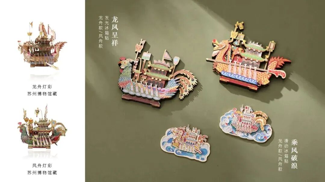 展品系列,以精美的龙舟灯和凤舟灯为代表,设计了龙凤呈祥系列和乘风破浪系列冰箱贴。