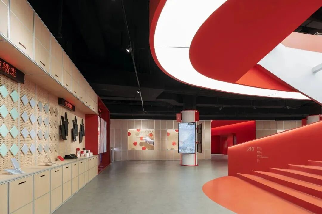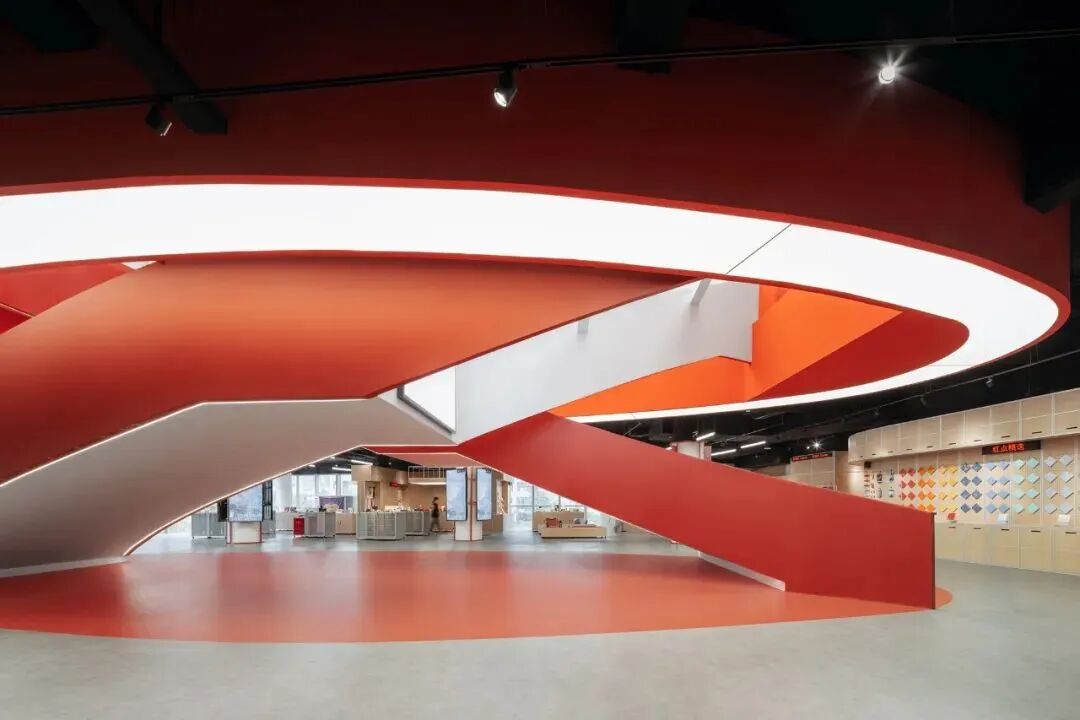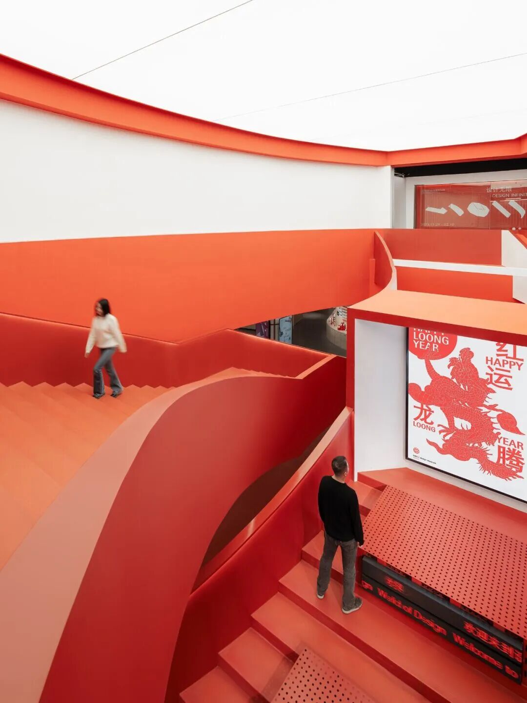 设计团队与跨媒介设计团队协作派对合作,充分挖掘利用现有商业裙楼的空间优势,打造博物馆的重点公共空间,即最具开放性的商业零售区及餐饮咖啡区。通高的中庭空间作为全馆核心正对着博物馆入口,拆除了原电动扶梯,设计了极具标识性的巨型双螺旋红色楼梯取而代之,成为视觉核心。