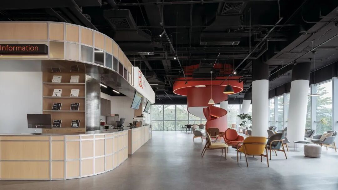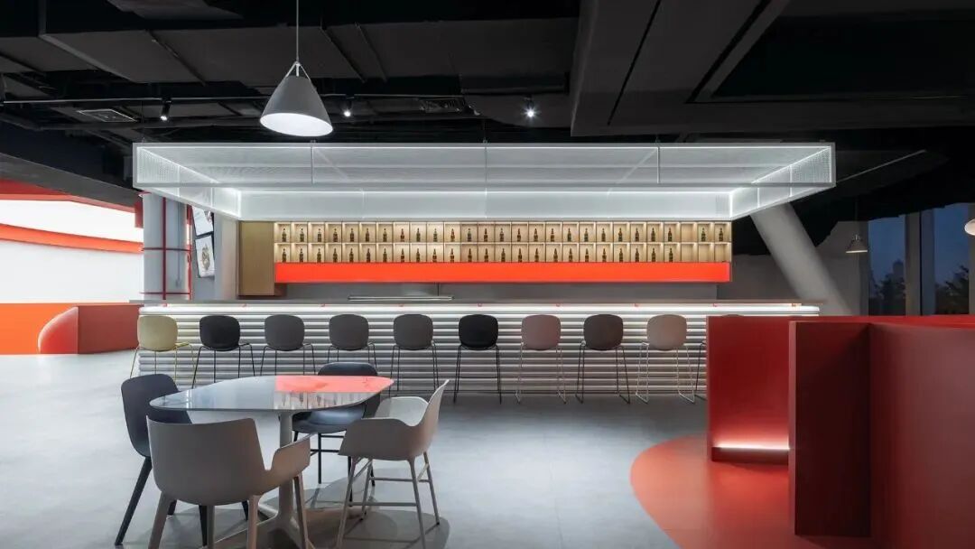 二、三层靠近玻璃幕墙的空间正对着厦门园林博览苑,充足的光线和美好的景色已然非常奢侈,仅增加了功能性吧台、利旧获奖灯具和家具,便轻松打造出舒适的观景咖啡厅及餐厅,并以鲜明的红色螺旋楼梯相连上下二层。