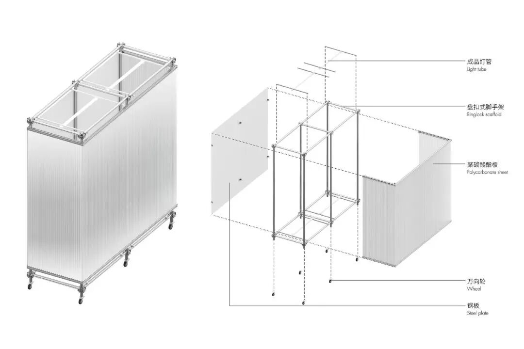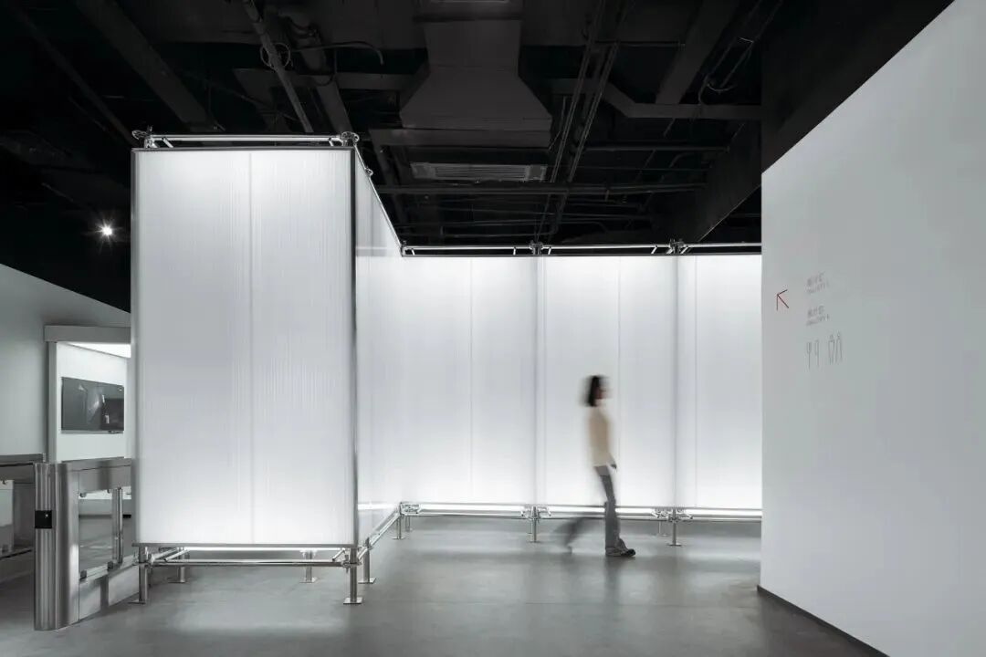 空间分隔界面预制化:运用工业设计的思维,采用脚手架等预制化元素替代了常规的实墙作为灵活多变的展厅边界,打破了传统盒子式的封闭展厅空间。