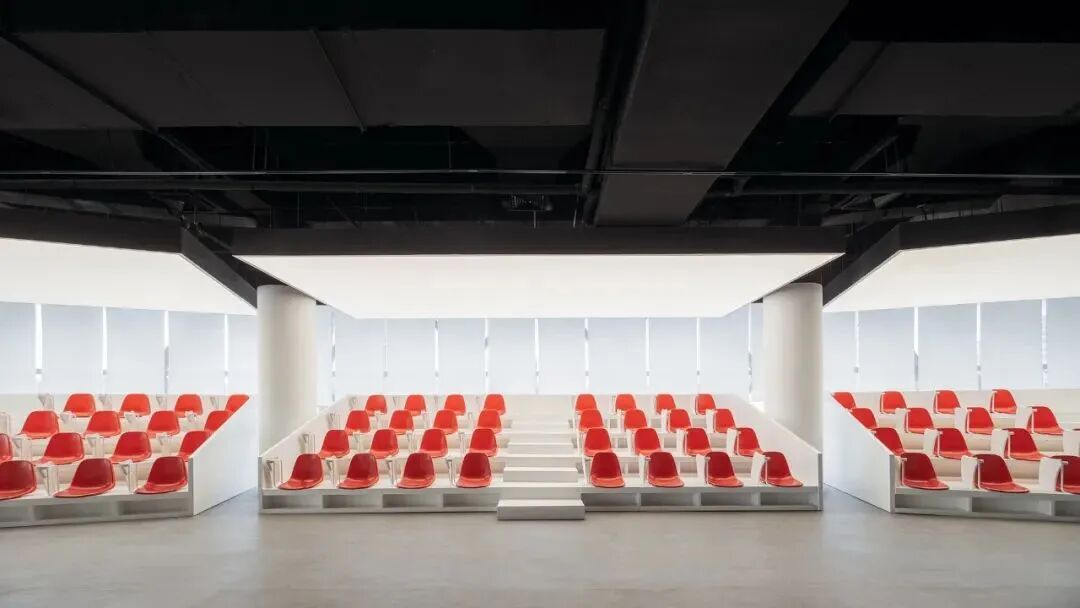 红点设计学院为业内设计师提供培训及交流的场地,不定期举办课程、论坛等活动。为了适应丰富的使用场景需求,设计了灵活的多功能剧场式看台,座位与旋转桌板均可拆卸。