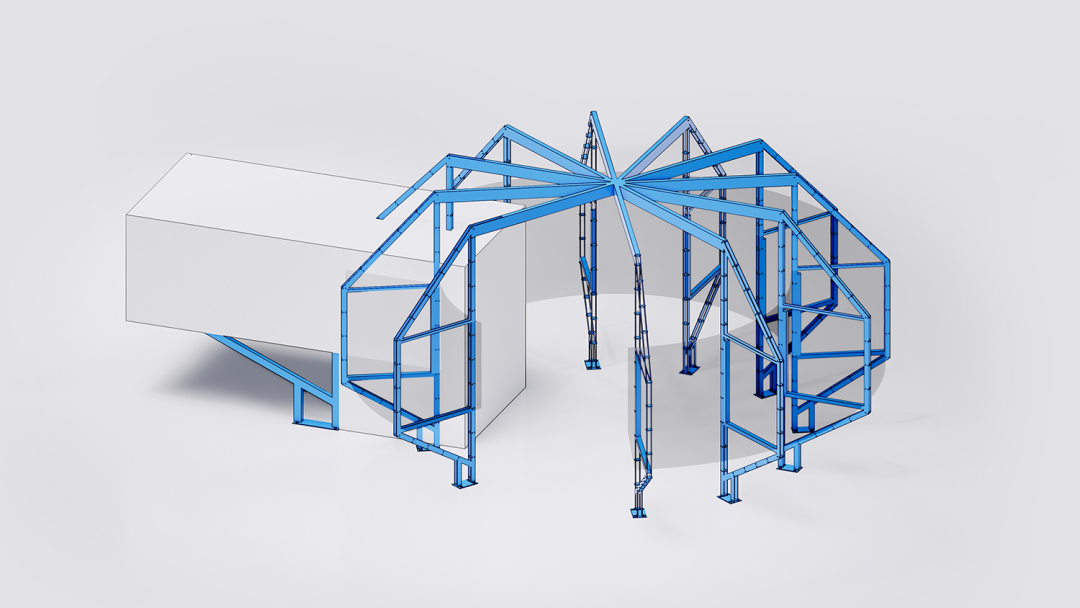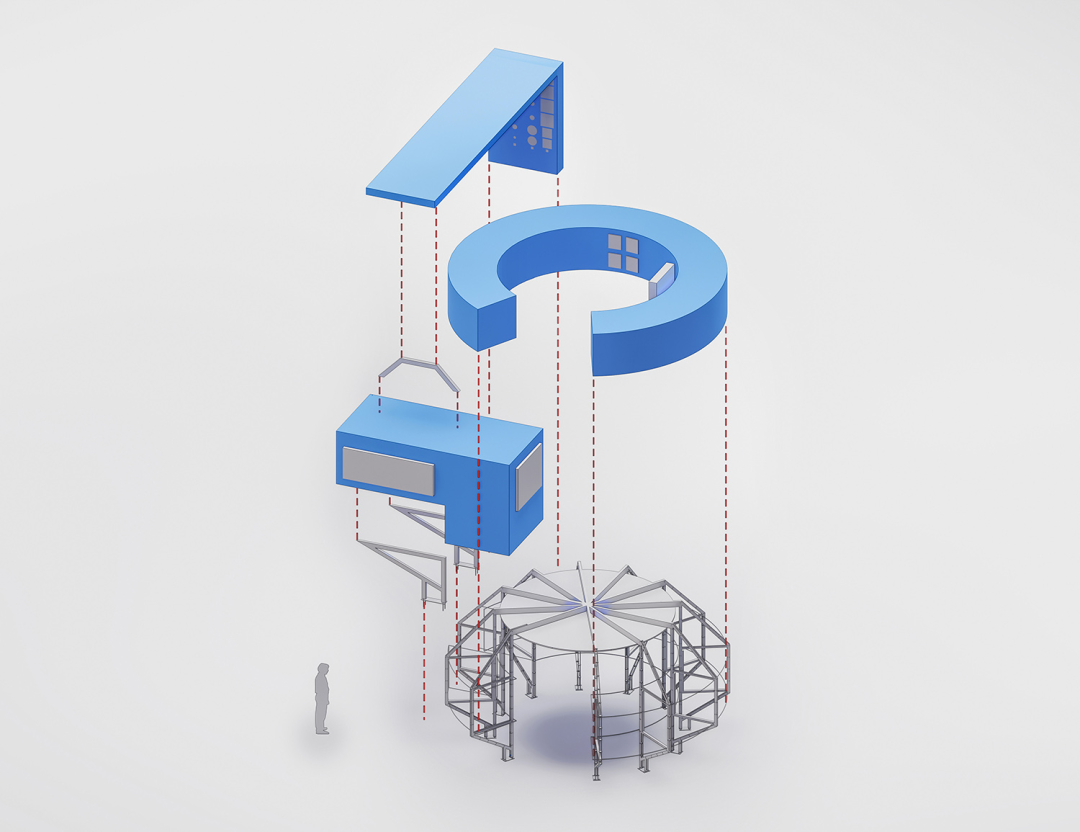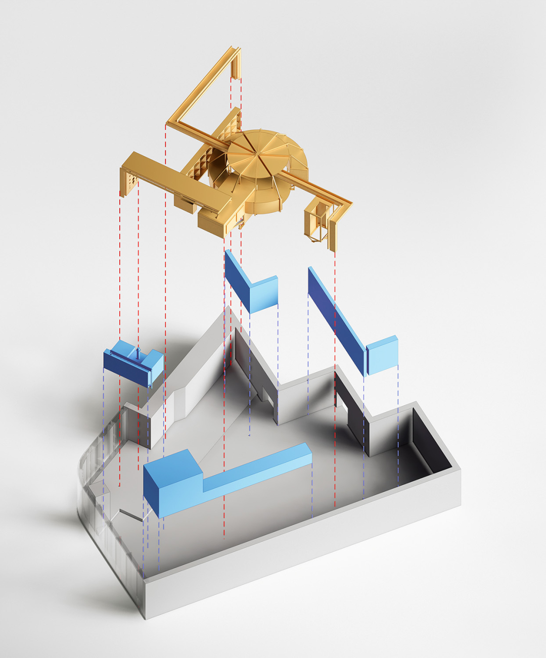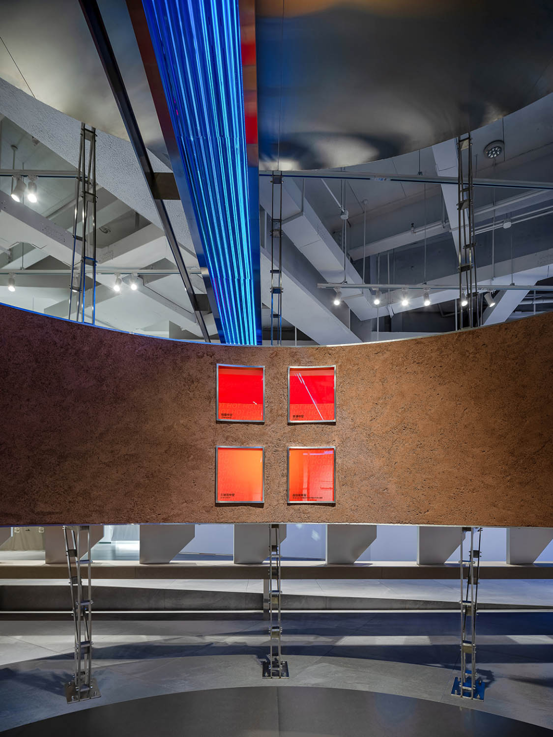 常规展厅,空间是信息的组织容器与背景氛围,两者在设计逻辑上是分离的,信息就像是空间中的装饰、空间就是信息立体化的背景,展厅的体验只是空间感的阅读。该展厅尝试用信息自生长的逻辑打破这种禁锢。将建筑原本的空间消解,让信息根据自身基因进行实体化演变。结构、力学、材料、造型、媒体设备都是这个信息生长的外延,它们的生长一方面让传播衍生出更多的维度,另一方面也完成对展示空间的规划、构筑、营造。展厅最终是一个可以被穿梭、被感受、被阅读的艺术装置。观展如同在雕塑的体内体外之间中巡游、沉浸,充满探索的乐趣。