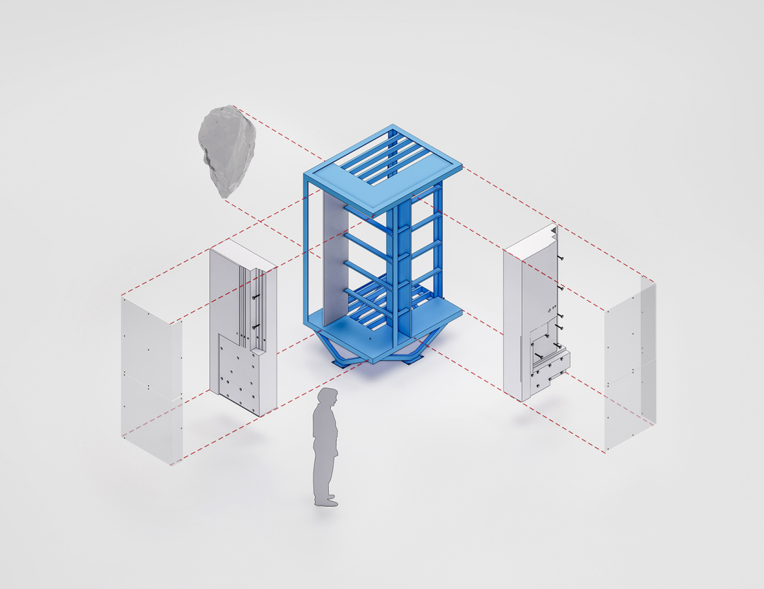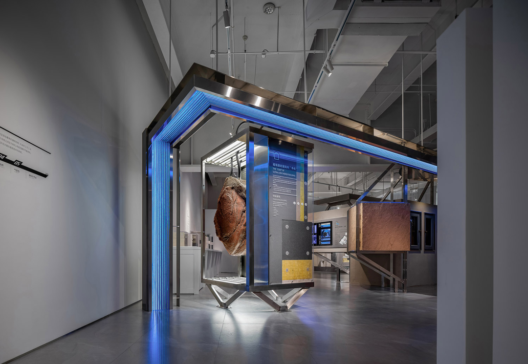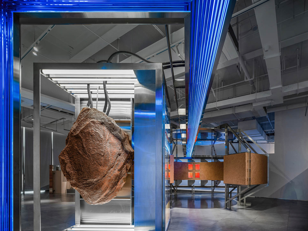 每个螺丝,每片金属,都支撑着装置与展品的真实重量。力学的逻辑下,材料呈现出原生的科技美感,与自然元素共同组成微量自然。