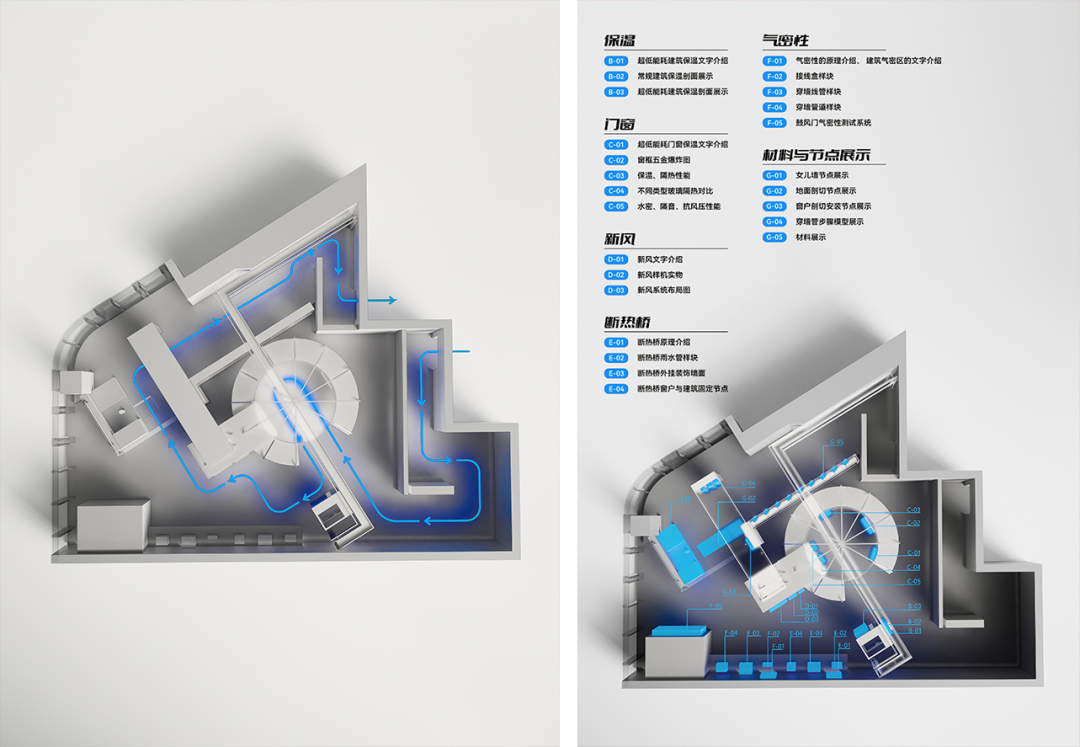 在装置上,模型、实物、视频、文字、图形、互动设备等各种展示形式对超低能耗建筑的原理进行了多维度的诠释,这让整个信息装置不只是艺术层面的情感化表达,同时也是科学层面的严谨论述。艺术与科学的结合让知识的展示富有乐趣与美感,也让参观的过程变成一种自主的探索行为。