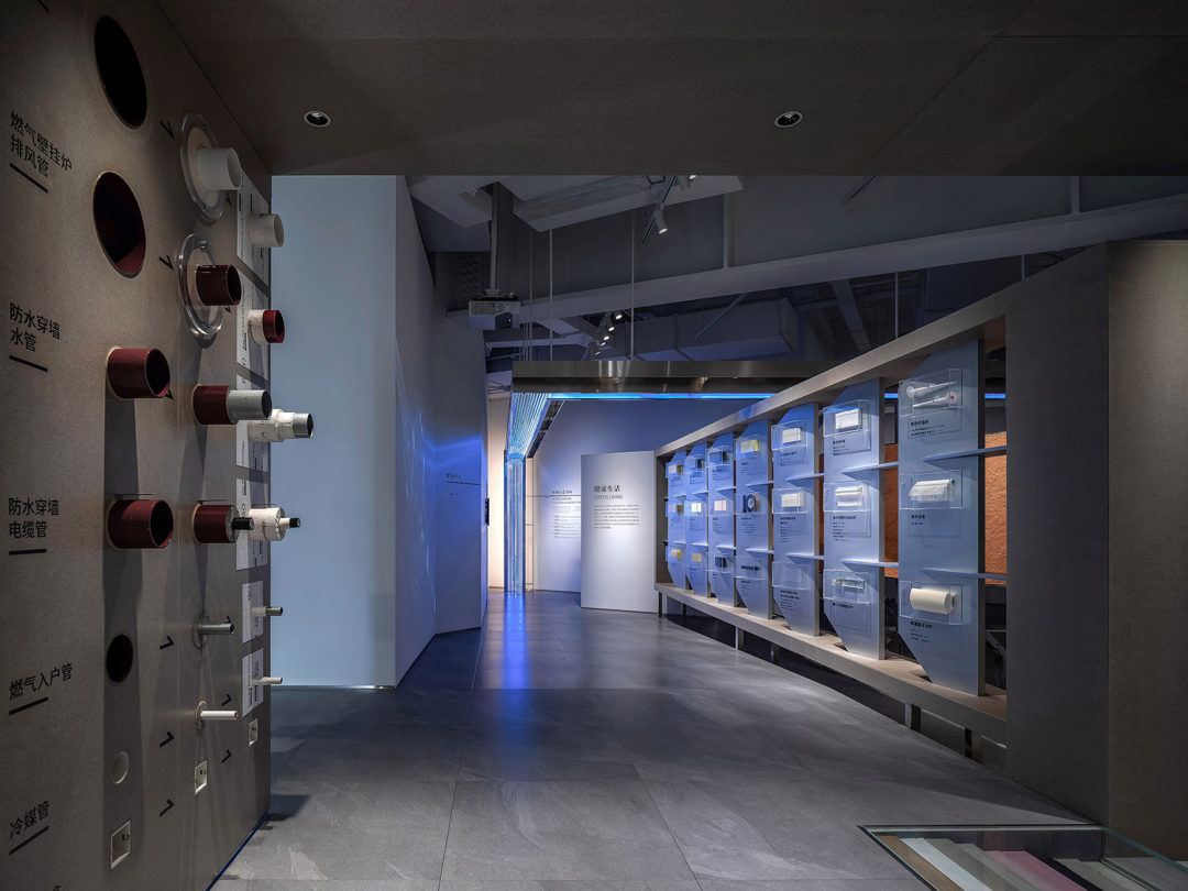 该项目位于西安市枫林九溪售楼处三层,目的是向观众展示超低能耗建筑技术。该技术为隐藏于建筑装饰面以下的非可视技术,晦涩、复杂、无观赏性。展厅通过信息生长、装置构建空间的设计理念,对硬核的知识进行解构、转译,打造出一个与众不同的沉浸感展示空间。