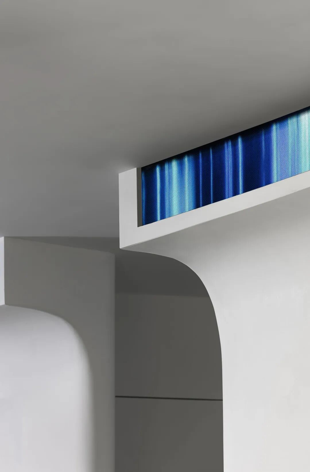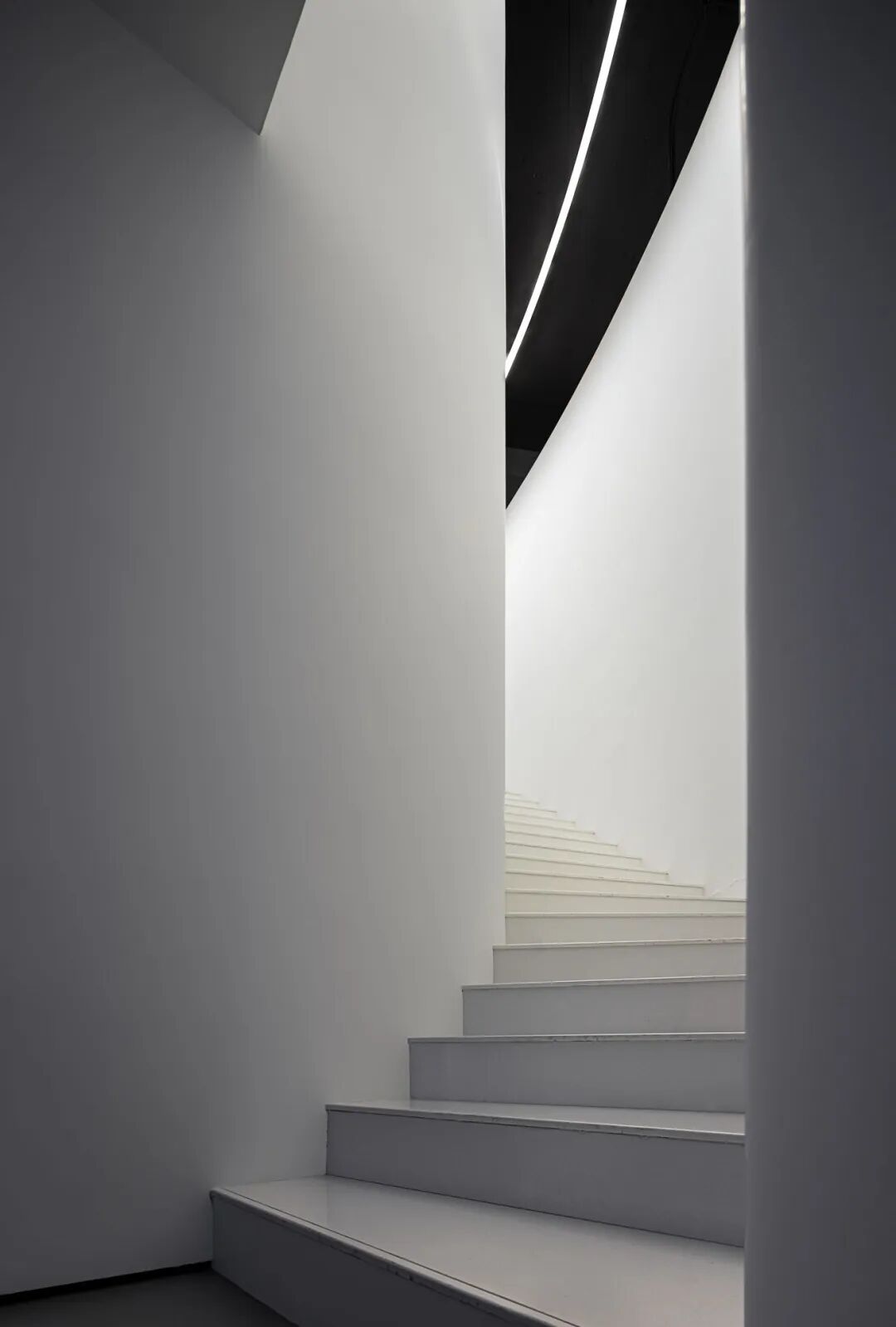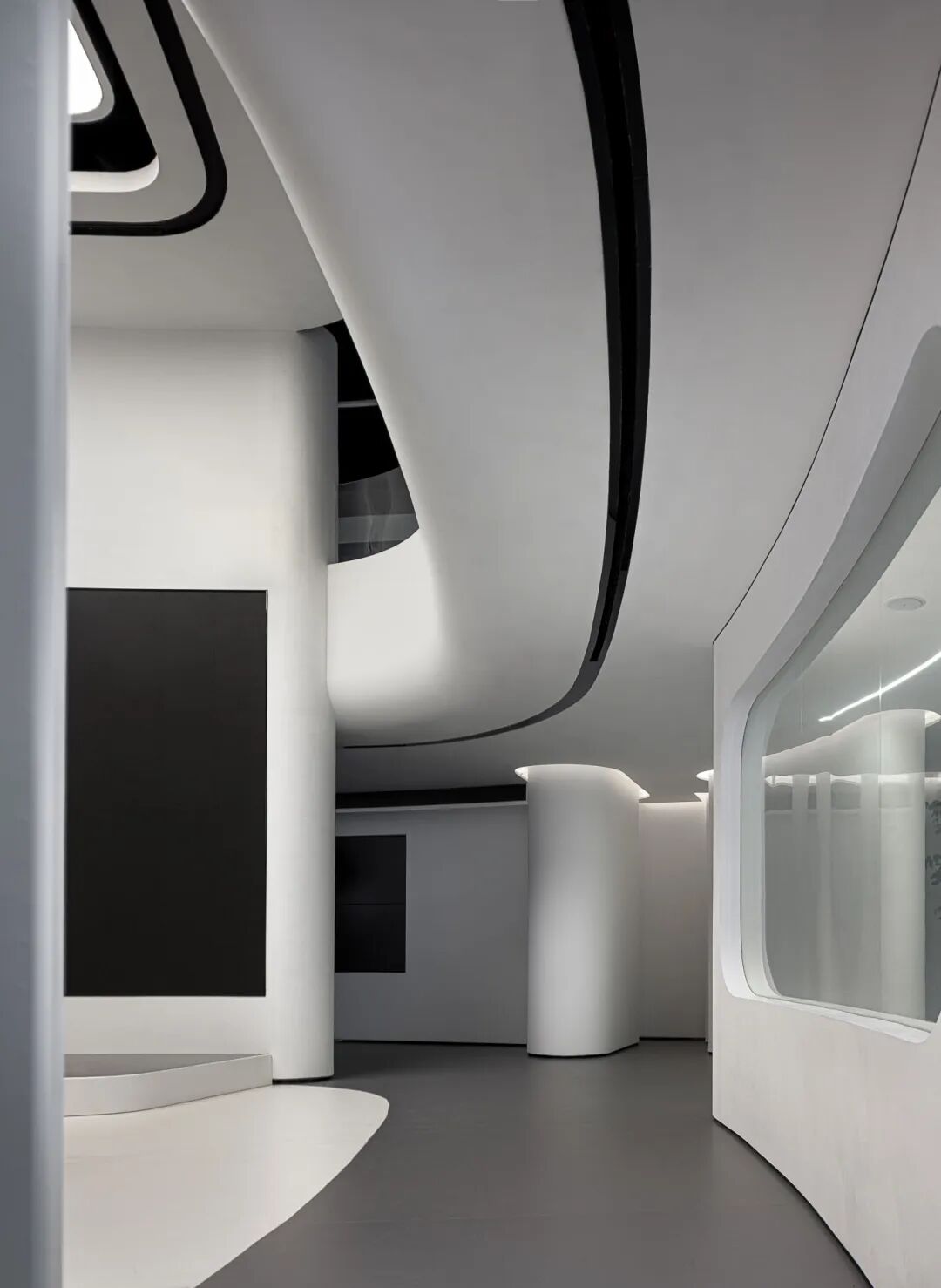 在材质及色彩上,整个空间以纯白并具有光泽的马来漆作为主要的饰面材料,表现了展厅的科技属性。