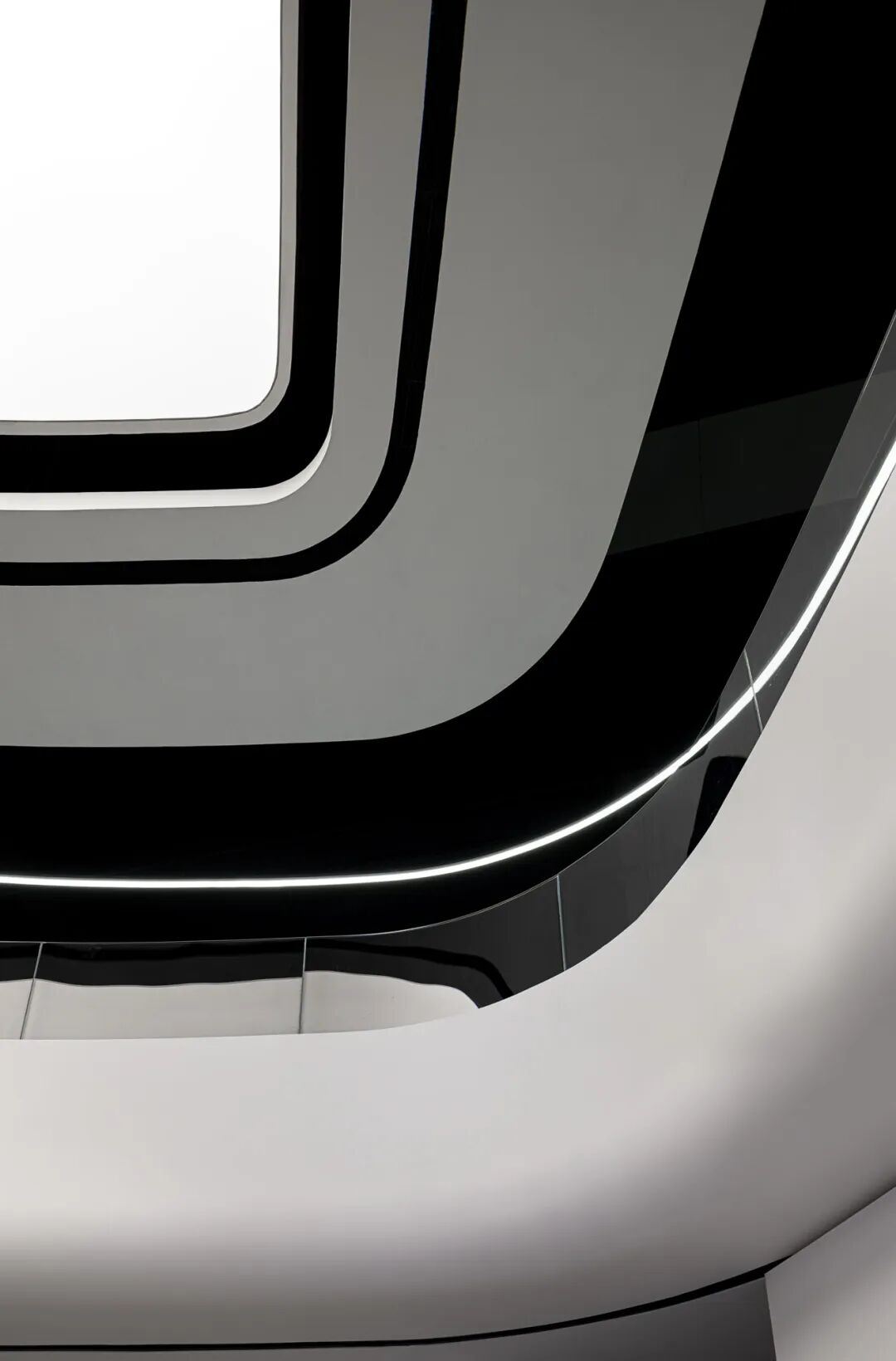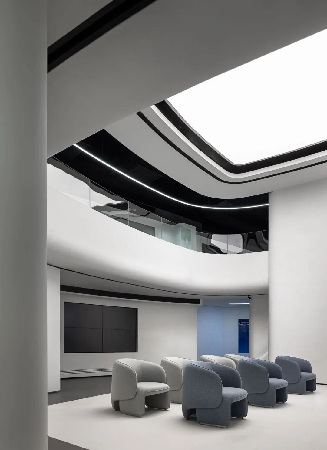 中国古代哲学家将其对宇宙的思考形象地表述为太极的图案,而这一符号又与现代数学中的黄金螺旋线十分相似。于是,我们以双黄金螺旋线作为设计的出发点,在平面布局上采用两条汇聚于同一中心的曲线来引领参观路线。这不仅增加了趣味性和引导性,更宛如一条纽带连接着腾云筑科与集团公司,展现出二者共生共荣的关系。