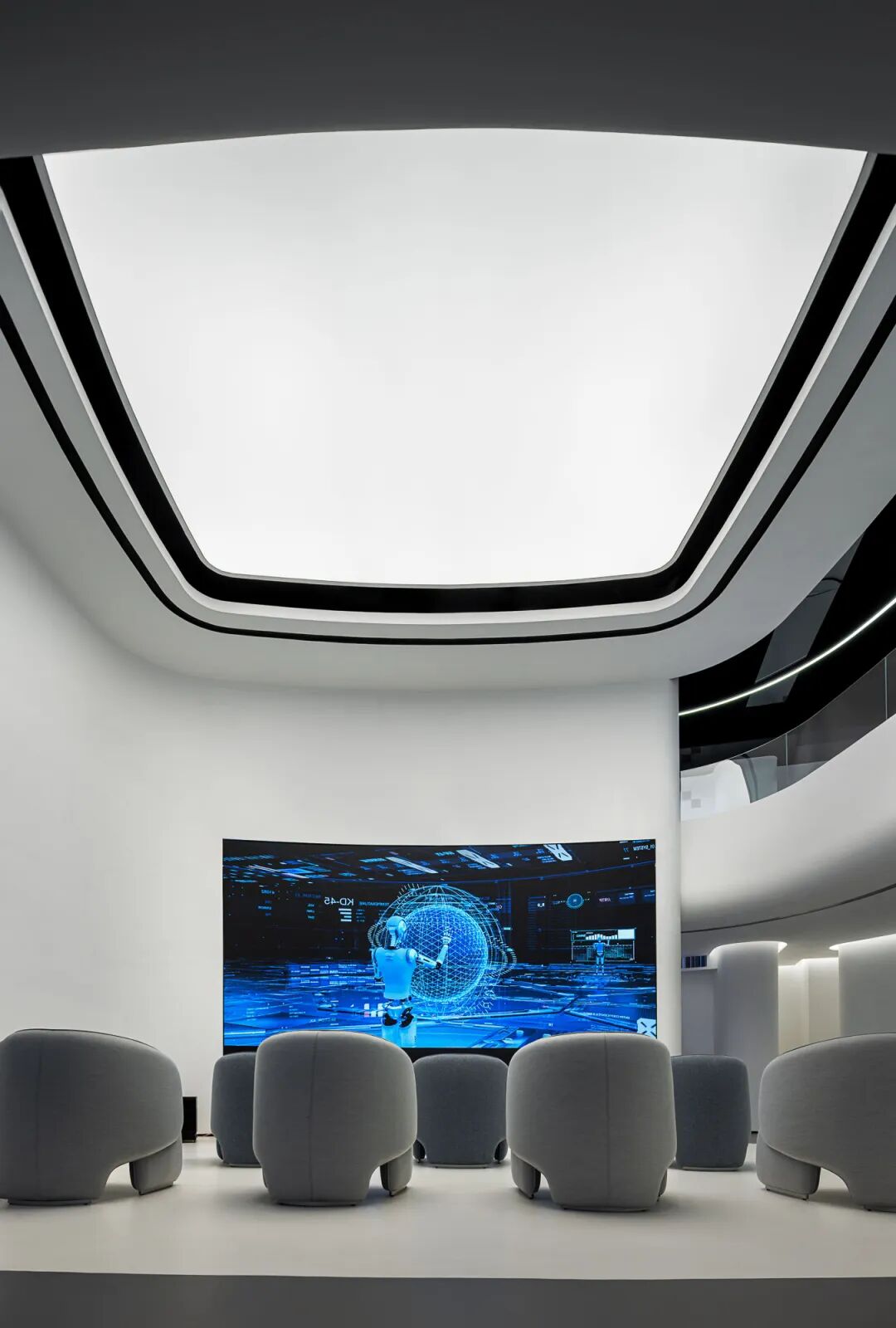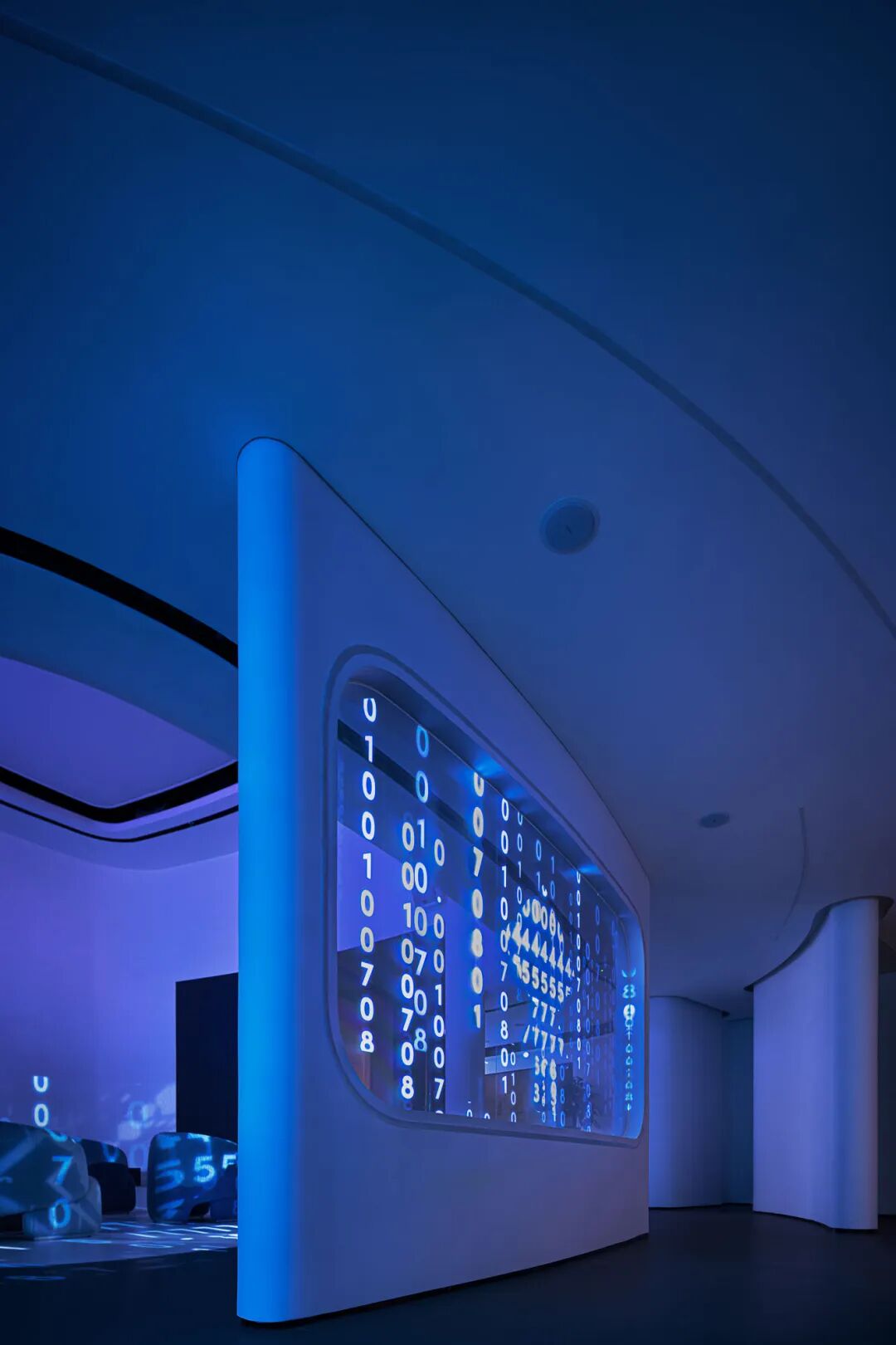 初入空间,最先感受到的会是动感的流线。在走过腾小圈全息投影及活动隔断墙之后,就来到了极富工业感的弧形中央挑空区域。在这里,通过对构件尺度的把控,给参观者营造出一种置身雕塑之中的景象。