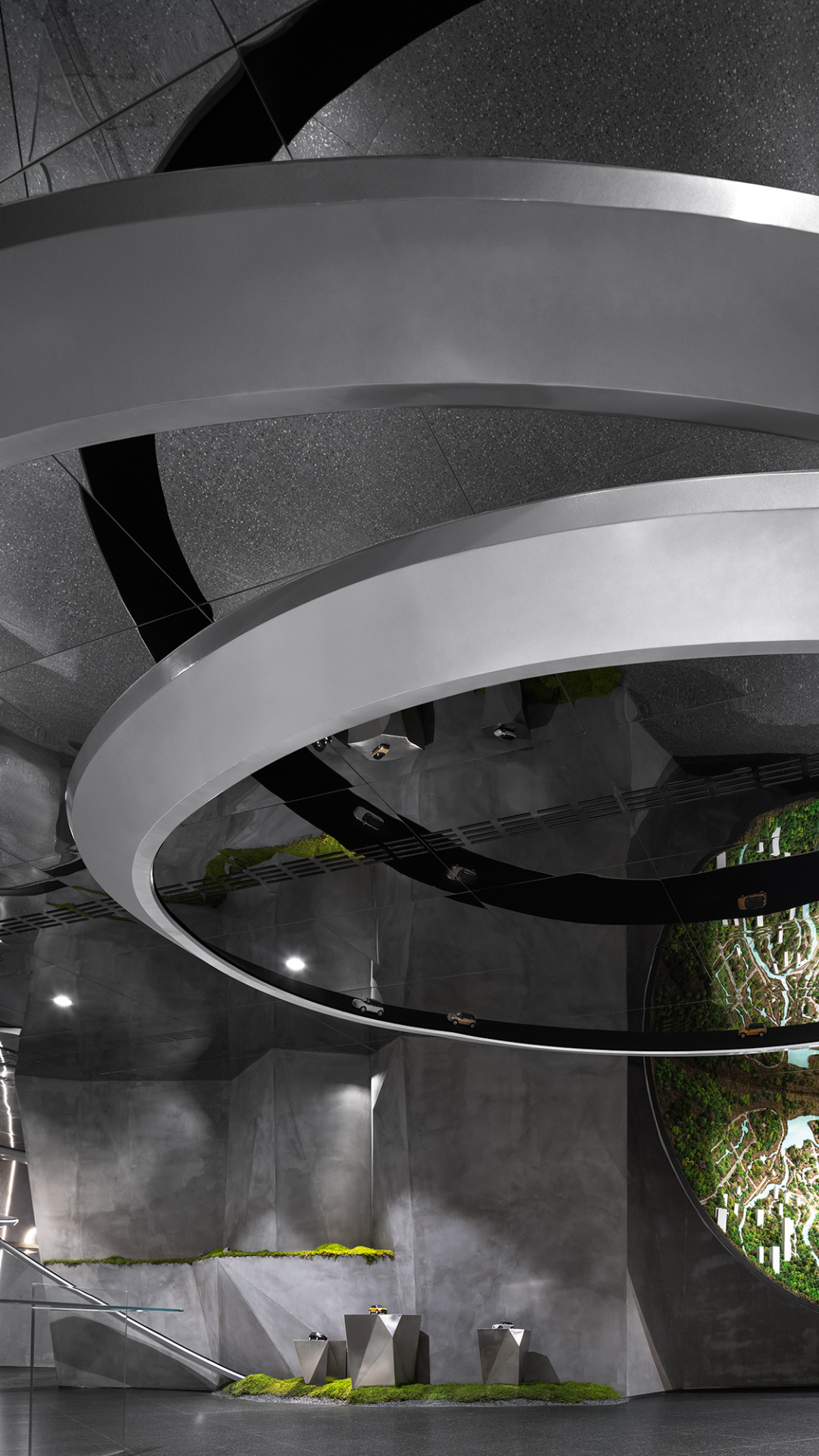 在MINI品牌展厅中,跑道是一个非常独特的设计元素,旋绕在整个空间中,体现出品牌的“自由自在”的精神性追求。设计团队在前期需要进行模拟,以确保跑道与汽车动线不冲突,并且跑道的高度和走向也需要满足汽车的挪动需求。此外,跑道还需要在视觉效果上带来一定的效果,增强空间的动感和张力。通过精心的设计和施工,跑道成功成为了品牌内核理念的有形载体,为展厅注入了强烈的动态属性。
