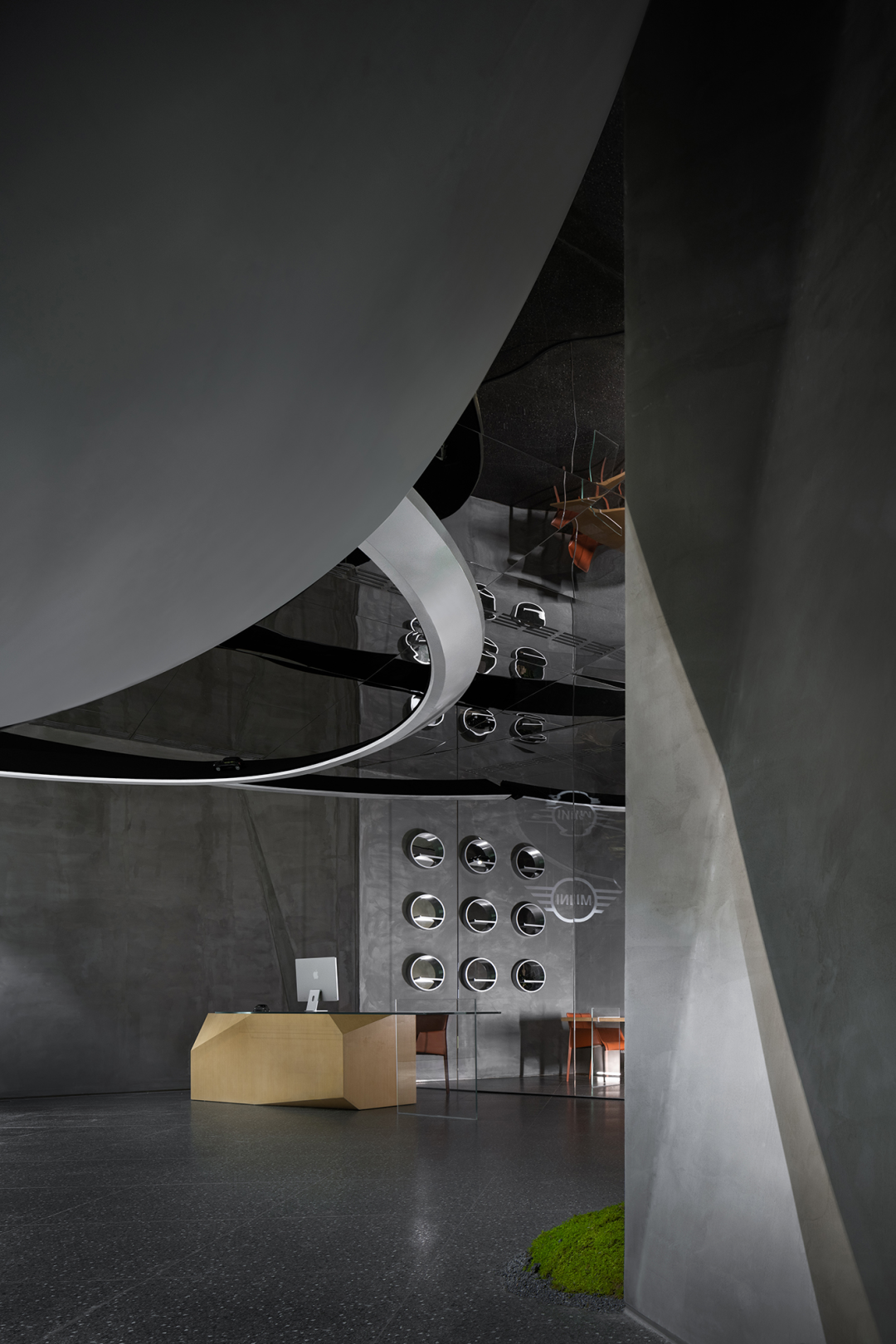 MINI品牌一直以来推崇的是不同个性的共同融合,旨在以自由和突破来打造品牌形象。基于这个理念,打造的“MINI”展厅是一个嵌入玻璃盒中的空间,拥有两个入口,一个位于商场主要入口,一个位于外街道入口。展厅内设有接待台、销售办公室和客户洽谈区。墙体上还设置了一个区域,供MINI车主分享他们的旅行照片。这一设计展现了品牌追求差异化、潮玩和共生共荣的品牌形象,将MINI世界的精神内核与展厅空间的环保可持续设计策略融为一体。