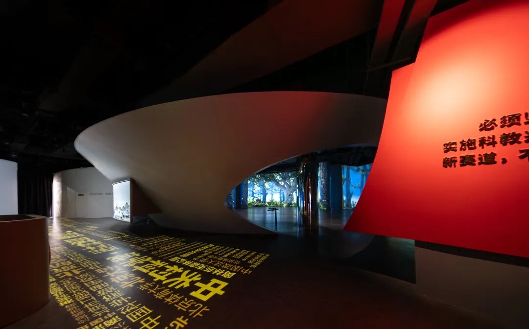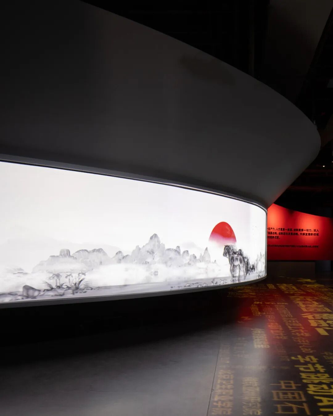 红色的旗帜也起到了序厅到正厅之间路线过渡和转承的作用。随着人群的进入,扇形的展示正厅里,科技、恢弘的宣传视频逐渐开启,讲述一段引人入胜的发展故事。