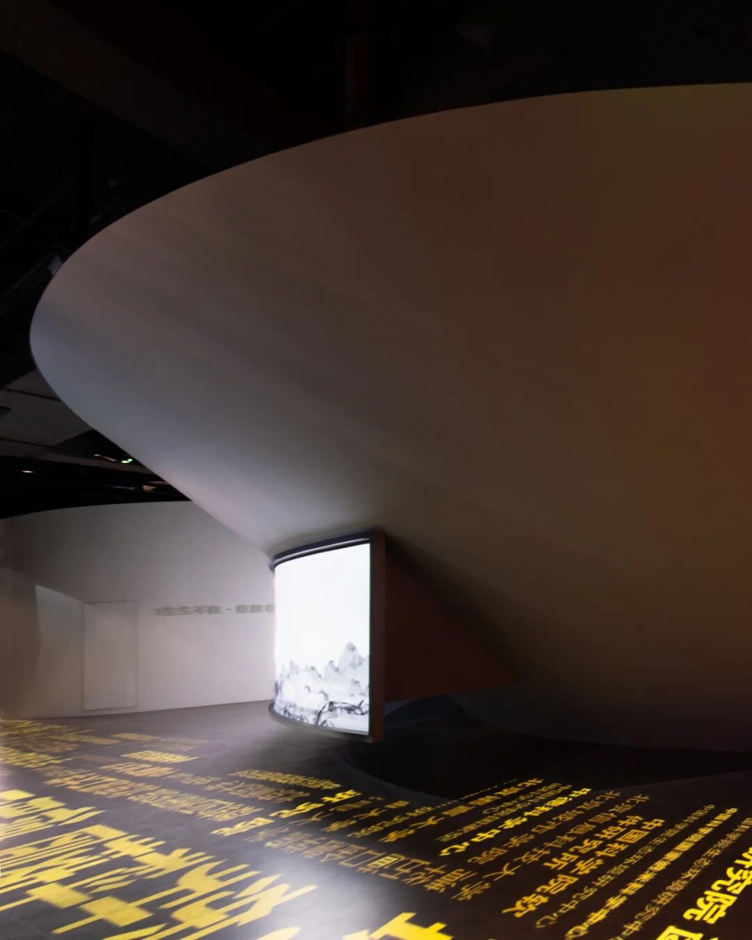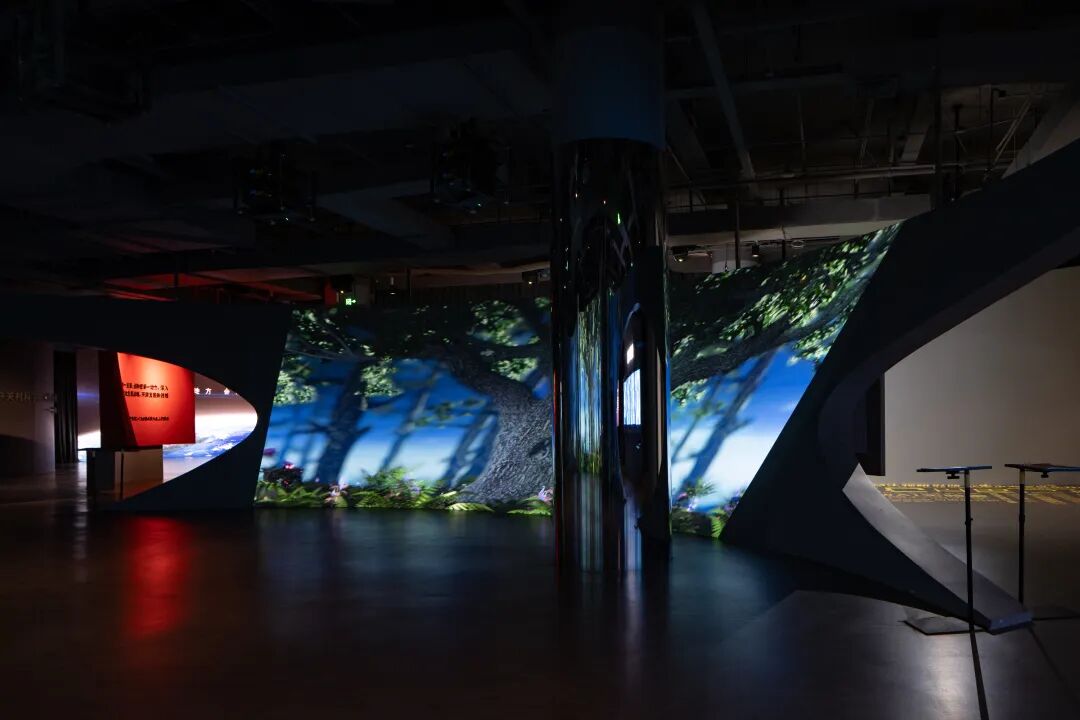 中心主展区,以树洞为概念围合而成。周边采用大弧度的曲面墙,将原有不规则的空间贯穿连续起来,形成更加流畅的参观体验。