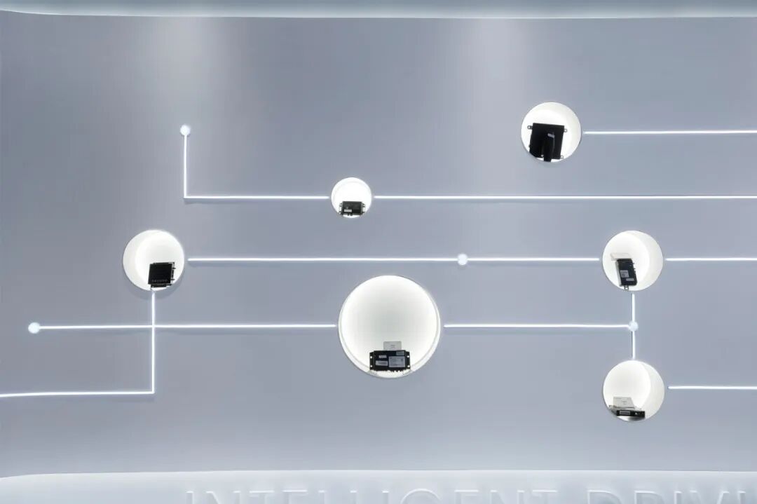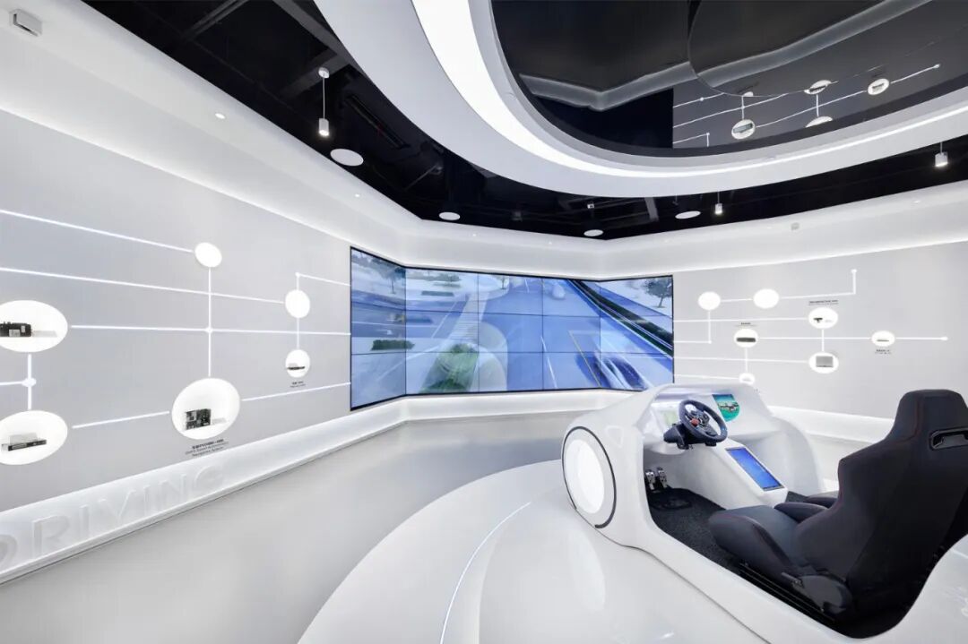 圆形线光把天花和地面展台相互呼应,形成一个富有设计调性的空间,将汽车模型陈列在白色人造石圆台上,通过圆台和灯光的叠加营造出漂浮于空中的错觉,正前方所对应的270°广角屏可感受与之匹配的视觉,这里既满足展示服务功能也成为了共享体验空间。广角屏的两侧充分利用空间尺度,采用白色墙面做背景,LED条形灯模拟芯片线路向四周延伸交汇点以展示各类车载终端,矩阵元素焕发出时尚动感的光,不同角度的直线构成简单的空间关系,构建简洁大气的视觉印象营造出的空间体验。