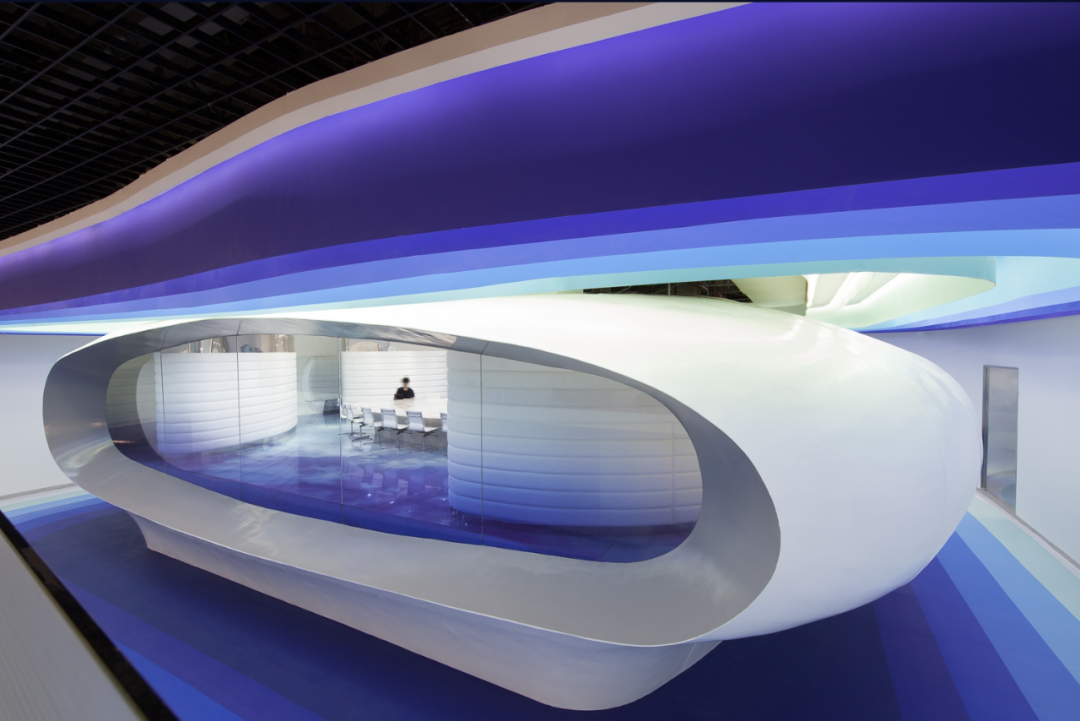 All interior design colors are pure white and seven tone blue: these colors define the brand identity of the logo and artwork. However, most design features are designed to create an intangible and positive atmosphere for visitors to experience simultaneously. A new concept of factory has been proposed within the data center: why not develop the cooling pipe room into a concept? The intricate design of pipes painted in different colors balances the digital artwork printed on the wall. The theme of the project is to transform the factory from a sad, oppressive, and efficient place to a happy, positive, and efficient place.The corridors between data centers are defined by artworks, colors, and graphics, implying the concept of crossing the sky. The purpose of the break time and some typical floor planning projects in the leisure field is to introduce an objective and happier workspace into the atmosphere of "work and life" that may be first seen in Chinese factories: for some notorious American headquarters, the development of the office atmosphere has shifted from a serious and corporate perspective to an informal, cool, and more humane atmosphere.