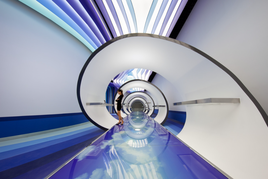 The purpose of this project is to symbolically celebrate that the Internet is seen as an information flow through space. People participate in this mysterious reality and find their own cloud. Strengthening this concept, products such as other spatial galleries or conference rooms are included in cloud mode in Illustrator software design and printing between plastic film laminated glass panels, in order to achieve stunning results in color resolution and reflection of an art floor. A bird's-eye view of the entrance hall of the display room connected to a 30 meter long tunnel in Guangzhou is expected to cover the cloud layer on the floor. As tourists pass by, sensors are connected to projectors to reveal the image of the open cloud, revealing a bird's-eye view of the city if tourists fly above.
