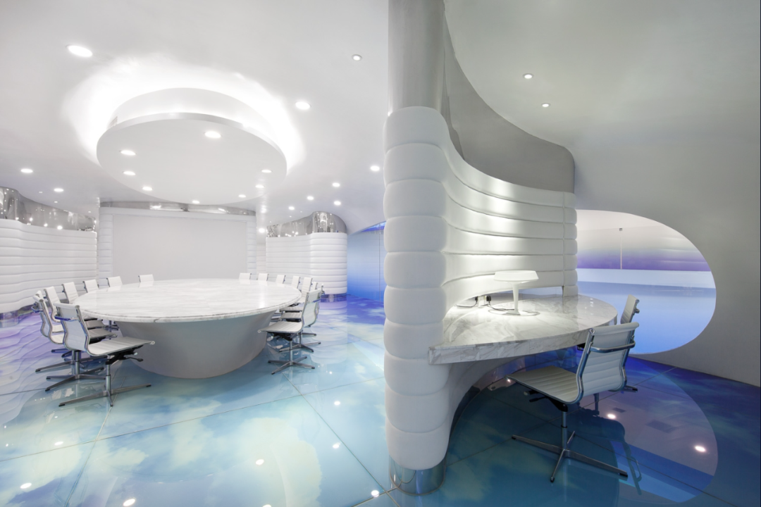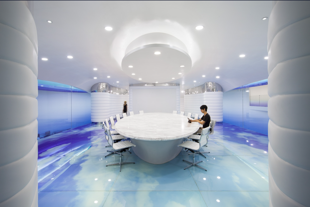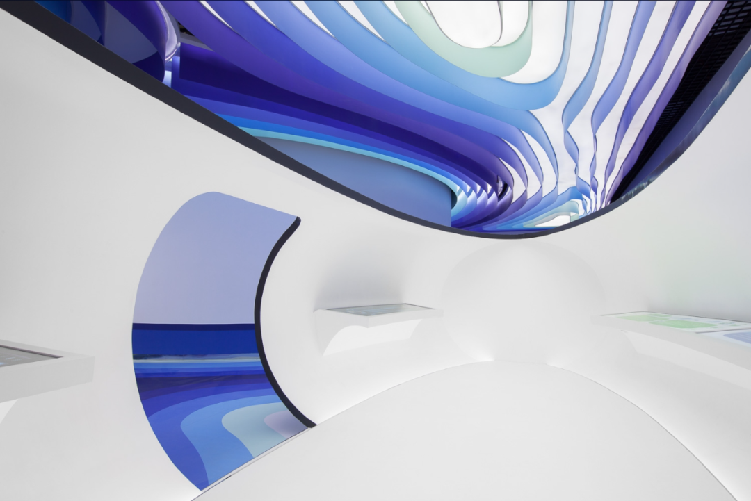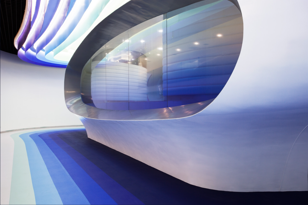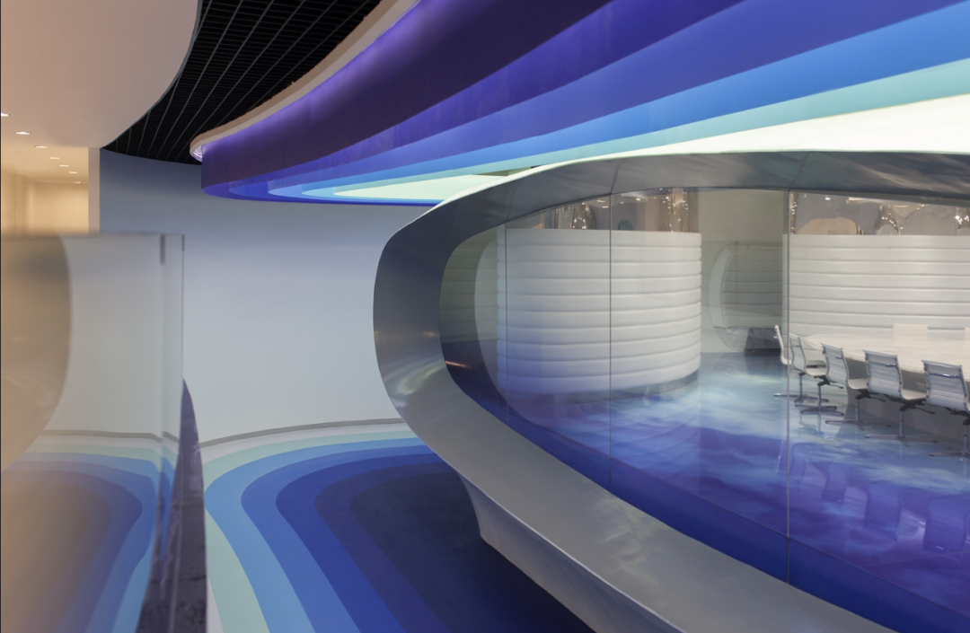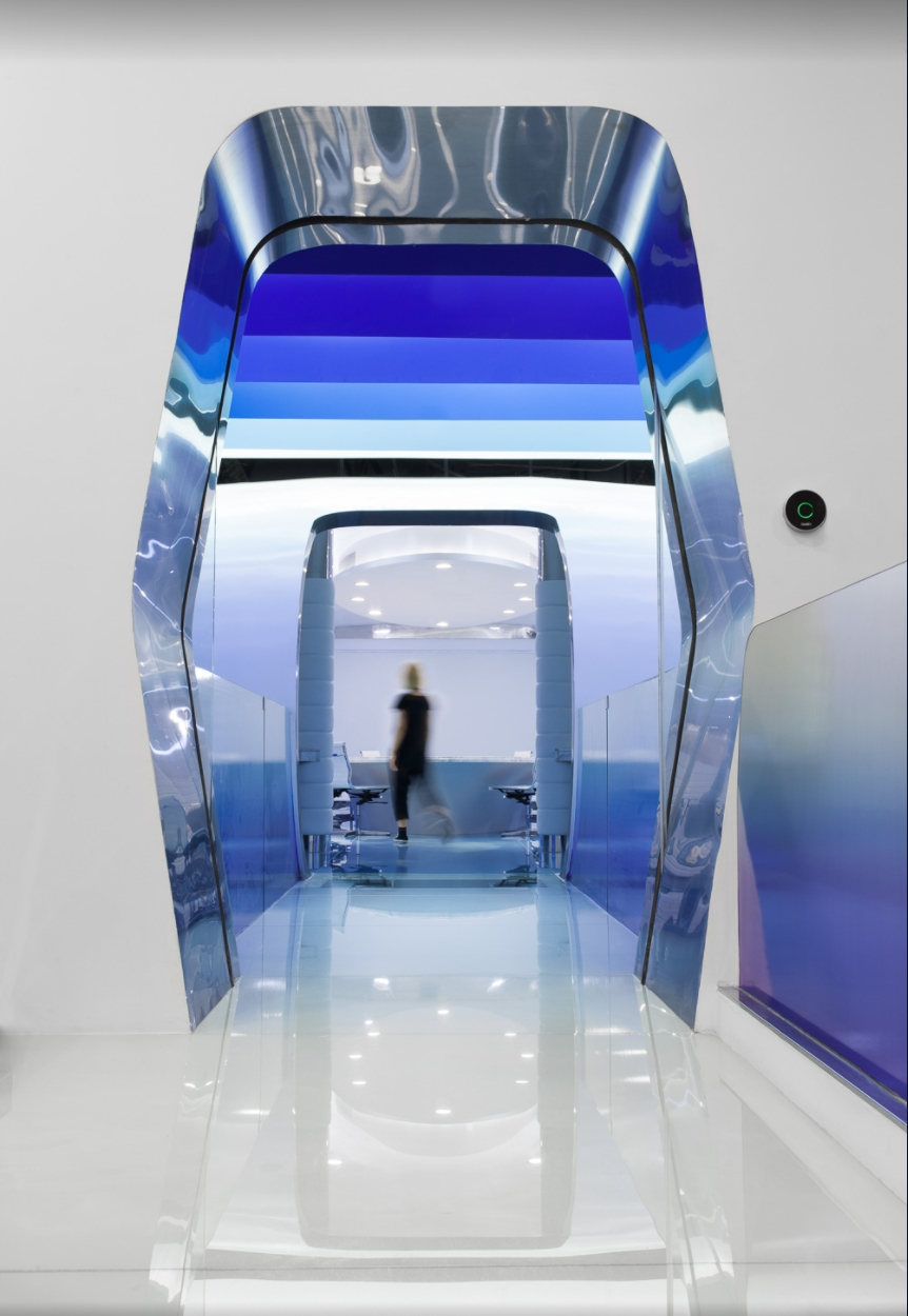 Considering the name of Cloud DCS company, the theme of this project is about an image of a cloud that contains knowledge brought by the wind, defining layers of gradually fading blue tones in the sky to depict today's digital communication. The fluidity and dynamism of clouds formed by wind are expressed through a 30 meter long layered ceiling sculpture, which is a microcosm of digital communication in space and highlights its non-material but powerful properties. The characteristic of this ceiling is made of metal profiles painted in seven blue gradients, covered with Barrisol's elastic fabric and illuminated by neon lights. The intricately carved artworks defined by the ceiling are reflected onto the floor, like a huge oil painting printed on resin, giving people a feeling of walking in the sky.