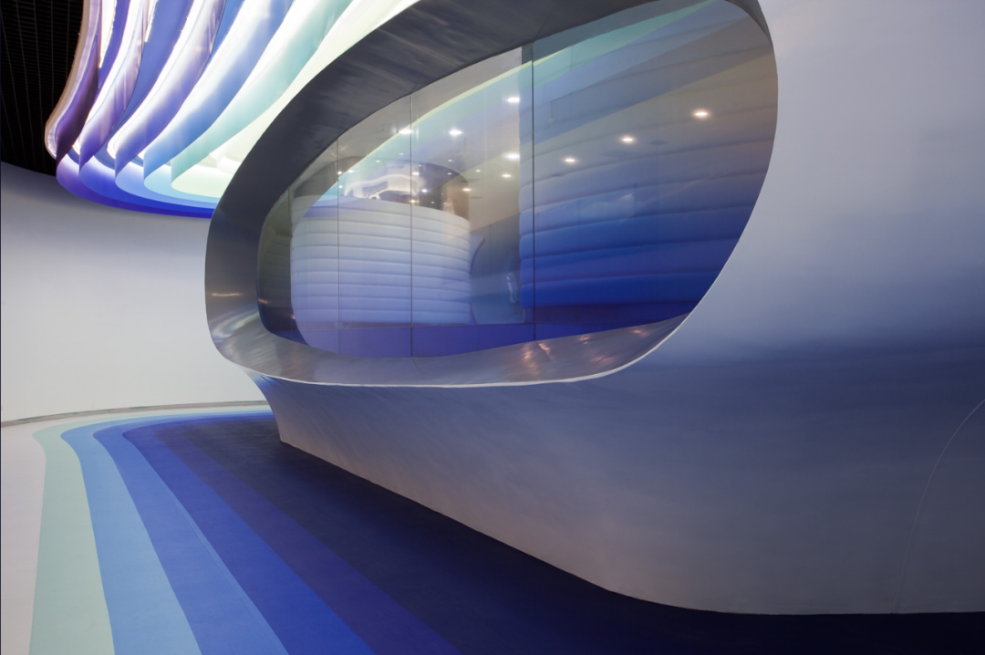 考虑到云DCS公司的名字,这个项目的主题是关于一股云的图像,它包含了风带来的知识,在天空中定义了一层层渐淡的蓝色色调来描绘今天的数字通信。风形成的云的流动性和动态性,通过一个30米长的层层叠叠的天花板雕塑来表达,这是空间中数字通信的缩影,并突出其非物质的但强大的性质。这个天花板的特点是由涂成七种蓝色梯度的金属型材制成,上面覆盖着Barrisol的弹性面料,被霓虹灯照亮。天花板所定义的精雕细琢的艺术品被反射到地板上,就像一幅巨大的油画印在树脂上,给人一种在天空中行走的感觉。