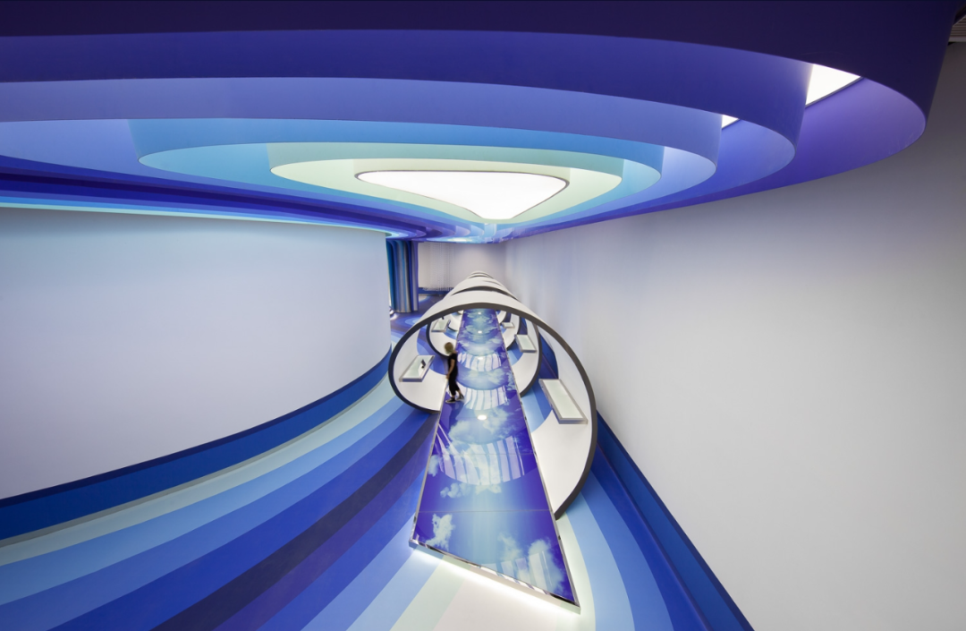 所有室内设计的颜色都是纯白色和七色调的蓝色:这些颜色定义了标识和艺术品的品牌标识。不过,大多数设计特色都是为了让游客同时感受到一种无形和正能量的氛围。在数据中心内部提出了工厂的新概念:为什么不把冷却管房发展成一个概念呢?画有不同颜色的管子错综复杂的设计与墙上印刷的数字艺术品相平衡。项目的主题是将工厂从一个悲伤、压抑、高效的地方转变成一个快乐、积极、高效的地方。数据中心之间的走廊由艺术品、颜色和图形定义,暗示了穿越天空的概念。休息时间以及一些休闲领域内的典型的地板计划项目的目的是将一种客观工位更快乐的工作空间引入可能首次在中国工厂的氛围“工作和生活”:对于一些臭名昭著的美国总部的公司办公室的氛围的发展从一个严重的和法人的看着一个非正式的,酷,更人性化的氛围。