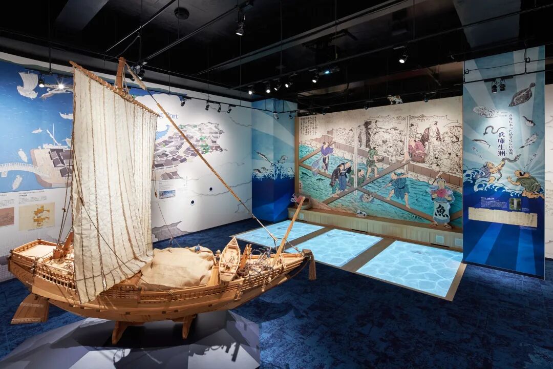 进入博物馆的接待大厅,首先映入眼帘的是北前船型的纸灯装饰,它们悬浮于头顶,营造出一种温暖而欢迎的氛围。脚下则是一幅1868年的“兵库津”鸟瞰图,让游客在历史的脉络中开始他们的探索之旅。