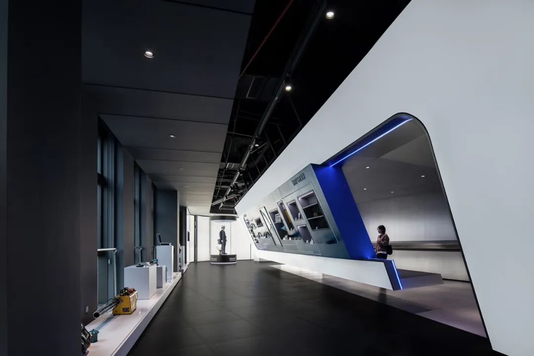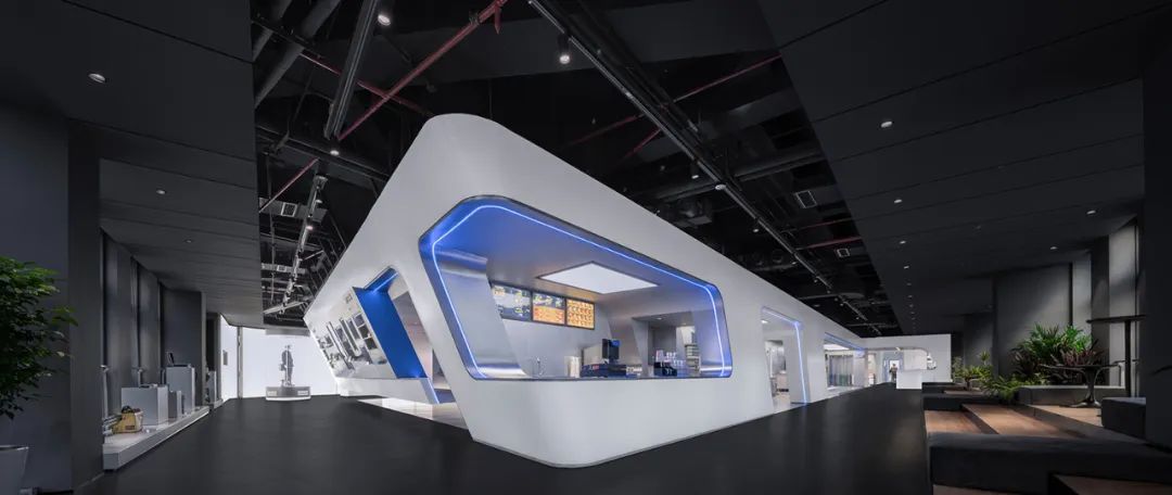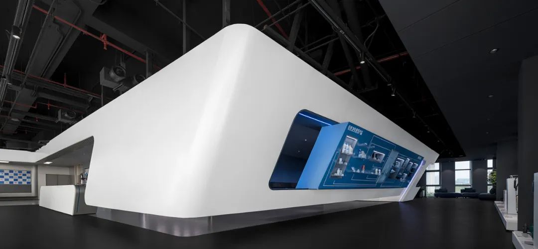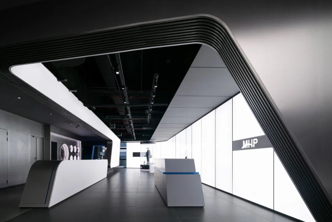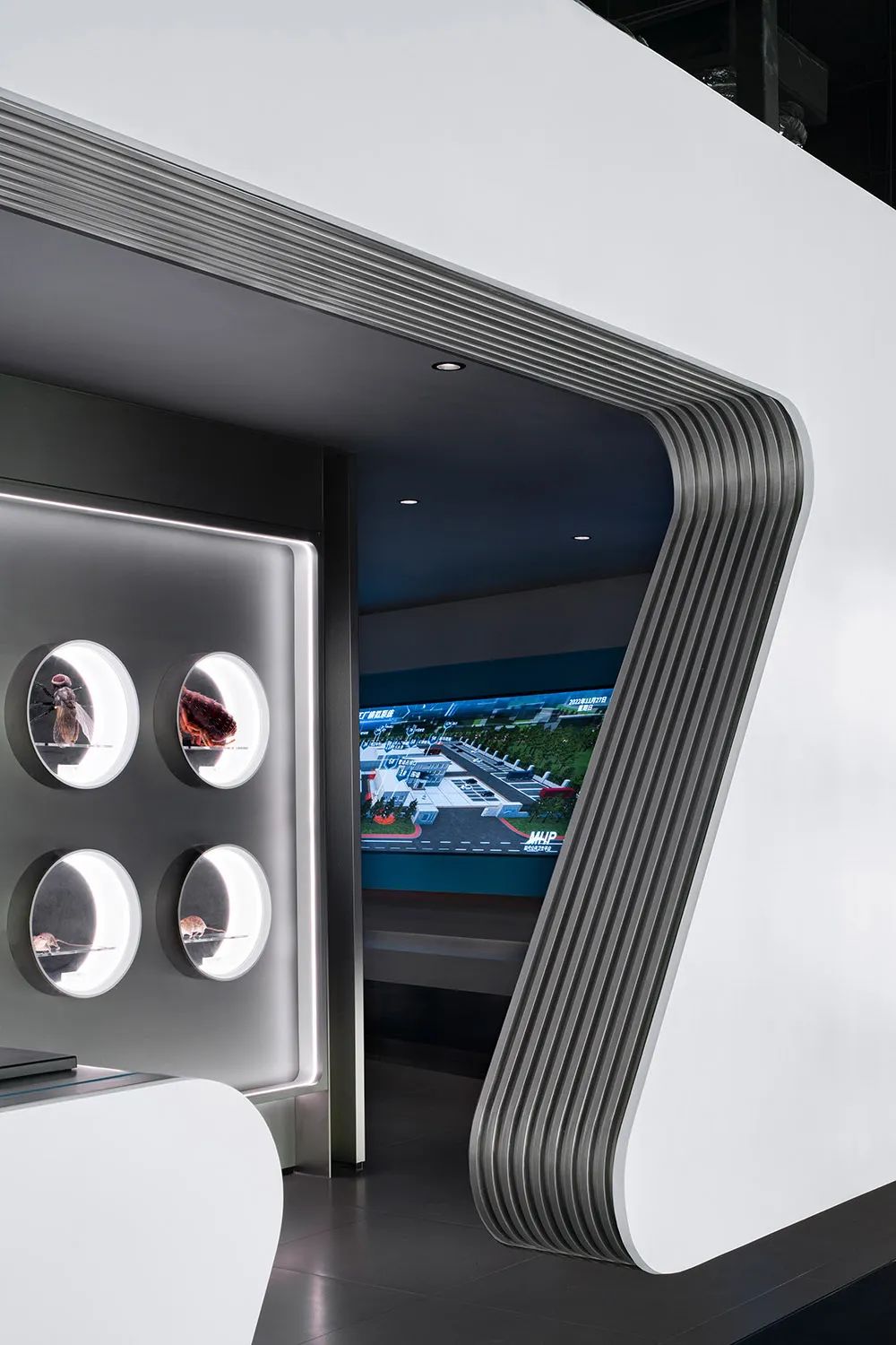 In the space inside the "skin", the MHP Modern Public Health Interaction Center carries iportant functions of professional training and display. It presents a space language with a sense of science and technology and a sense of the future, and brings immersive and highly interactive exhibition and training experience to the audience through digital display. The shape of the space is like the front of a sprinting car, which perfectly matches the original intention of MHP to create a high-quality real-life training base in the industry.