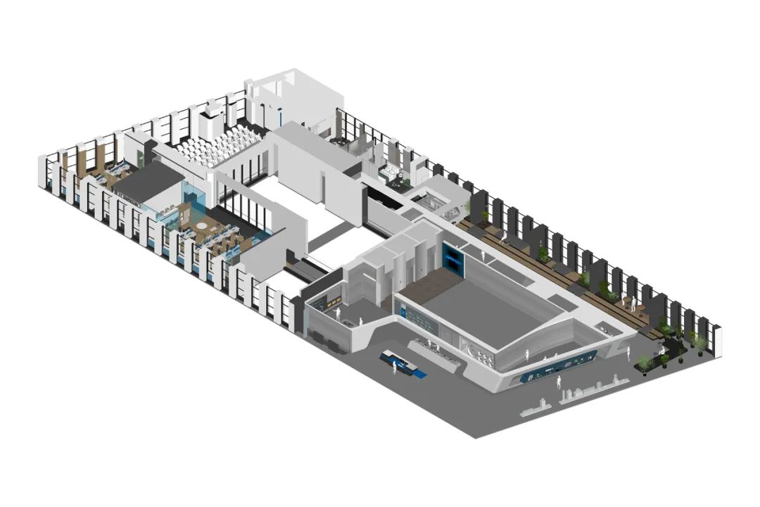 在"皮囊"内部的空间,MHP 现代公共卫生交互中心承载着专业培训和展示的重要功能。这里呈现出科技感和未来感的空间语言,通过数字化的展示方式为观众带来沉浸式和高度互动的展陈与培训体验。空间的造型宛如一辆冲刺的车头,与MHP致力于打造行业优质实景培训基地的初衷完美契合。
