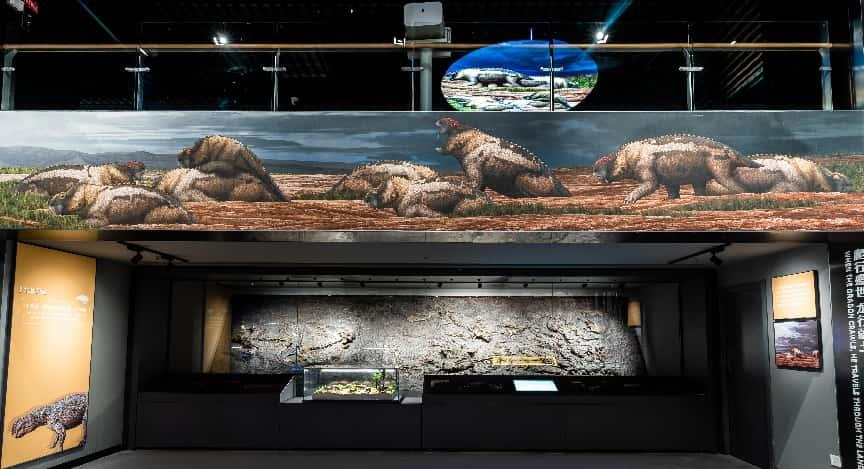 第二展厅“演化兴疆”:设计团队利用几何切割展台构建化石矩阵,配合剪影空间的光影叙事,使恐龙化石在明暗交替中呈现生命张力。生态景箱融合微缩造景与数字投影,复原5.4亿年前新疆海域生物群,在观众眼前展开远古时期新疆海洋的画面。