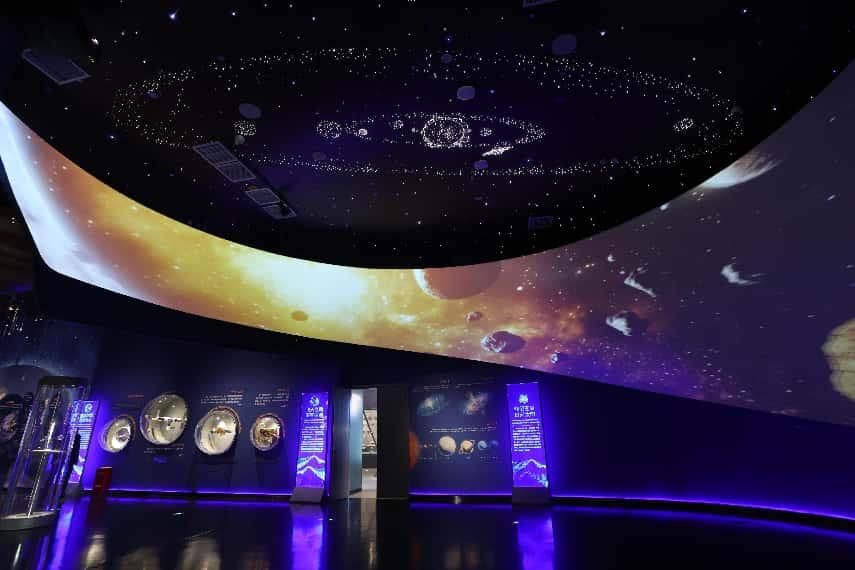 第一展厅“天地源疆”:设计团队以“宇宙大爆炸”为灵感原点,通过火山喷发动态模型与环绕式星空幕墙,配合低频声波震动装置,让观众身临其境感受行星撞击的震撼。陨石展区采用立体球形展柜,令新疆特有的铁陨石傲立于绘有星光的展板之中,凸显“天外来客”的神秘感。