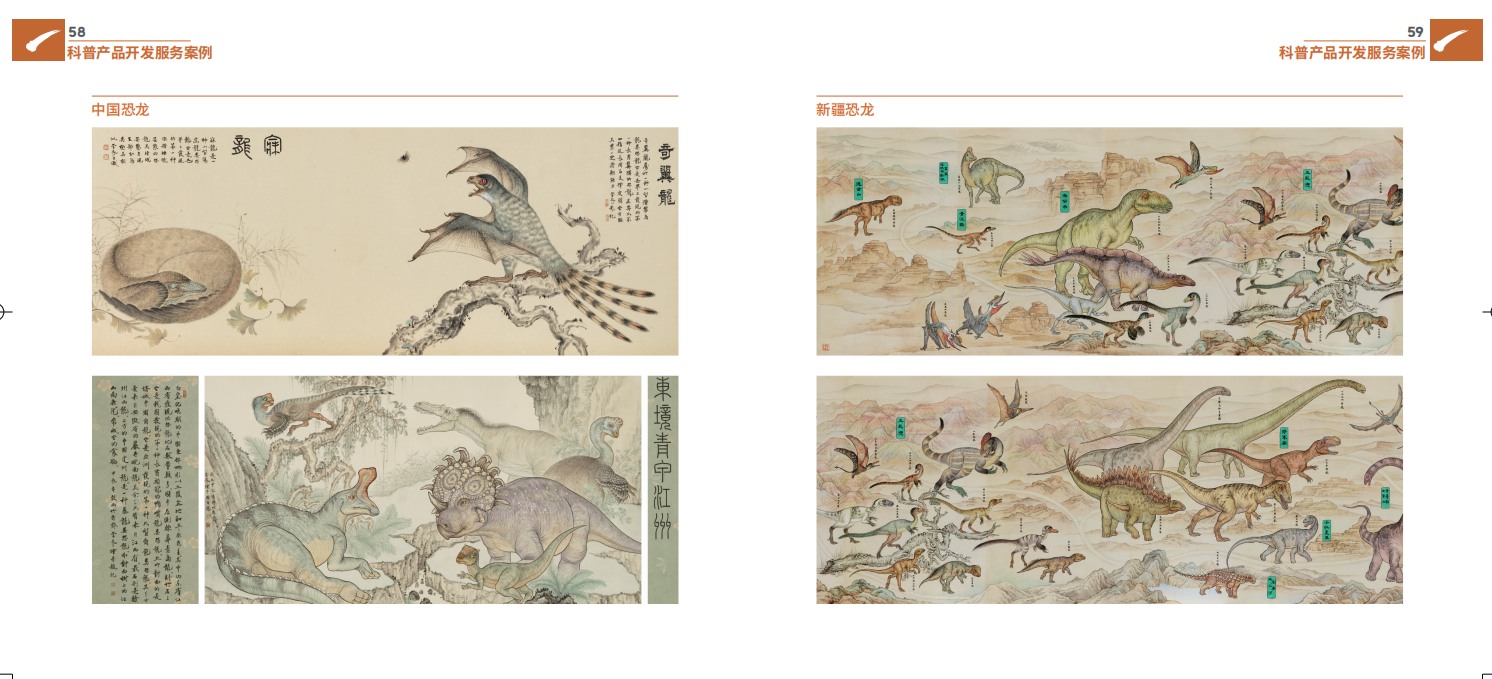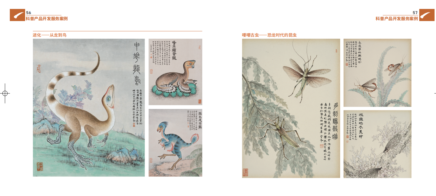 如:北京一彩空间工程技术有限公司的“国风科学艺术”系列作品项目与国家自然博物馆、中国科学院南京古生物博物馆、重庆自然博物馆、法国卢浮宫等自然类博物馆进行项目合作,运用中国传统工笔国画形式,创作出《进化——从龙到鸟》、《喓喓古虫——恐龙时代的昆虫》、《中国恐龙》等系列作品,尝试用更形象生动的手法描绘“进化”这一长时间、多层次的演化历程,为我们重新解读这段远古历程提供了全新的视角。