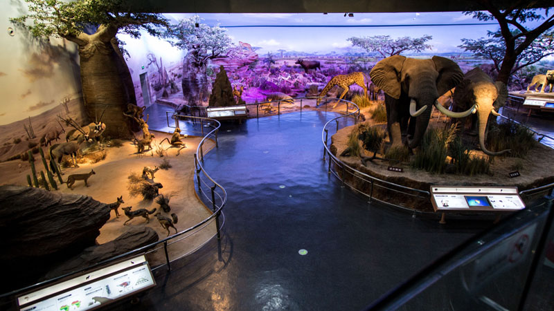 可以将人与自然的互动作为一种阐明科学知识的叙事方式,提取自然意象和自然实践活动,从建筑空间视角审视自然历史发展,利用图形、色彩、影像、声音、灯光以及旁白,从水平方向和垂直方向上塑造展示空间。通过微妙的并置叙事讲述藏品中蕴含的多重历史价值,强调空间与藏品之间的联系,构建生动的空间场景,使参观者通过直观和具象的视觉和行为体验,感知空间秩序以及展品与空间的关联,通过多维度和可参与性的空间叙事让科学知识可视化。