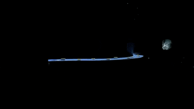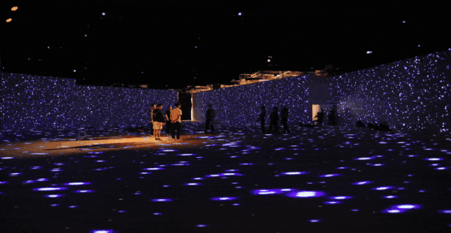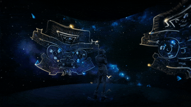 铺天盖地的星河包裹整个空间,空中五星汇聚,让人仿佛置身宇宙中心,随着观众的脚步实时交互变幻的二十八星宿,更身临其境地营造出漫步宇宙的神秘梦幻之感。