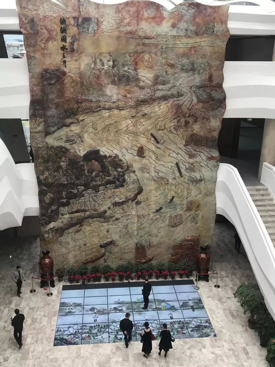 进入一层大厅内,高15.2米、宽9.8米的寿山石壁雕映入眼帘。 这幅名为“泱泱闽水”的壁雕,以福州地区特产寿山石为材料,采用国家级非物质文化遗产传统技艺寿山石雕雕饰而成;内容上以闽江为主,以旗山与五虎山为背景,体现闽侯得天独厚的地理环境。这是 迄今规模最大的寿山石壁雕 。
