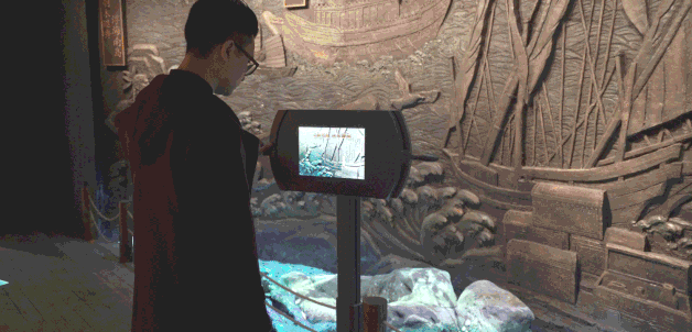 海上丝绸之路展区中设置了3个AR望远镜,以AR互动的形式查看每个浮雕的内容介绍,投影在浮雕上的水波纹,营造出海上拍浪的氛围。
