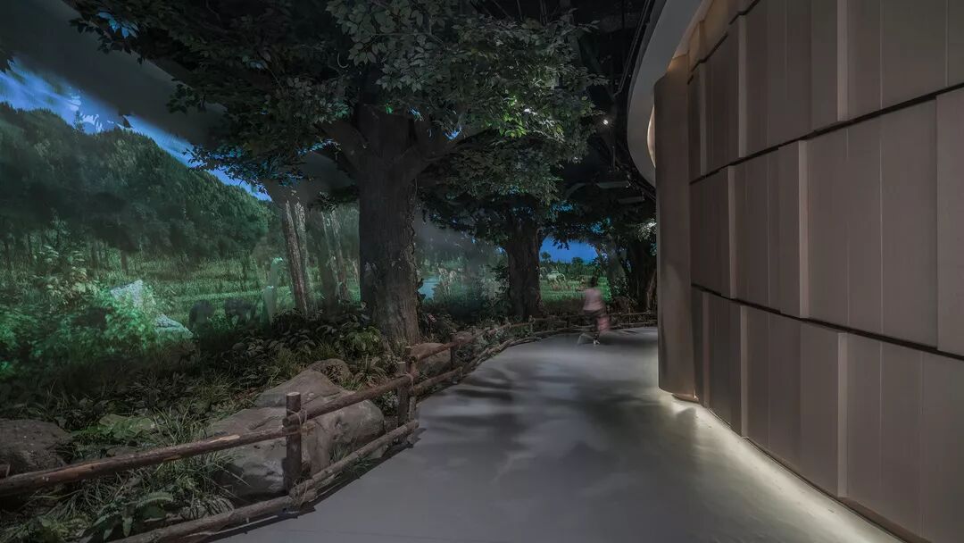 巧妙利用大型坡道空间,通过21台激光投影机结合半景画场景,以三维动态影片绘就一幅生态画卷,展现了闽侯海洋环境和生态环境的变化。观众漫步于幽雅之境,切身体验一场与大自然的千古对话。
