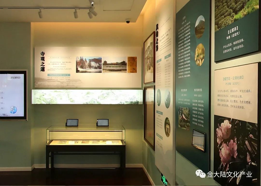 该部分利用高清显示器,循环播放“庐山优美景色” 配以 “庐山知名诗句” 剪辑而成的庐山人文风光片,并以图片形式展示了王维《远公龛》和黄庭坚《东林寺》等诗作。