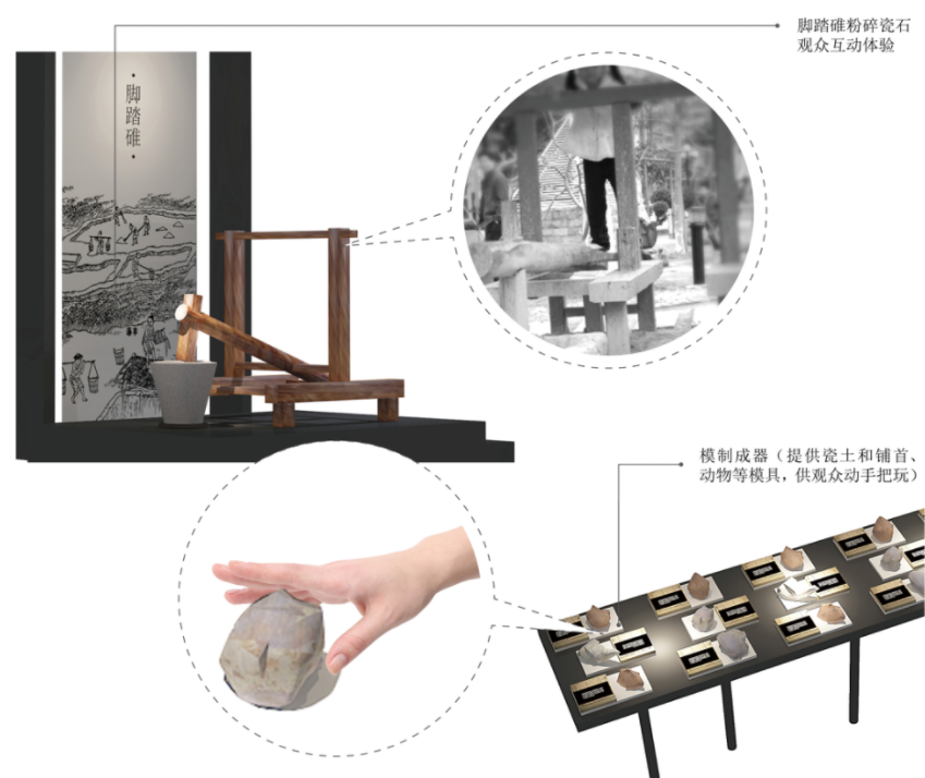 天有时,地有气,材有美,工有巧”的造物原则,在越窑青瓷中得到充分体现。练泥作为制瓷的第一工序,以瓷土阵列,解释瓷土的种类与化学成分。以脚踏碓的互动体验,体会古人练泥的方法。