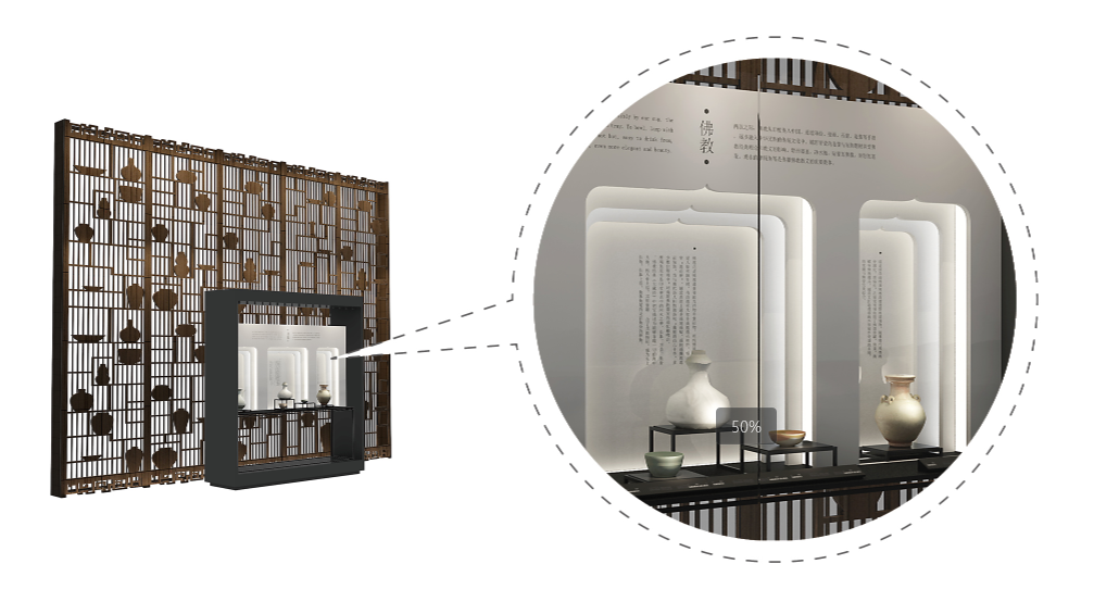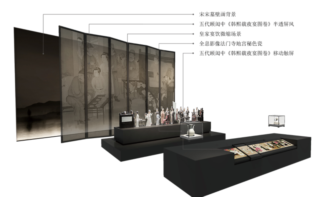 《韩熙载夜宴图》以屏风形式放大置于展墙,灯光暗下,通过半透的屏风可以看到“越窑秘色”的动画影像,在重叠的影像中,凸显古人对“秘色”绝艺的神往。微缩场景具体刻画了图中的人物形象,可移动触屏,对照古画,展示瓷器,阅物读事,觥筹交错间折射出官宦生活的奢鏖与讲究。