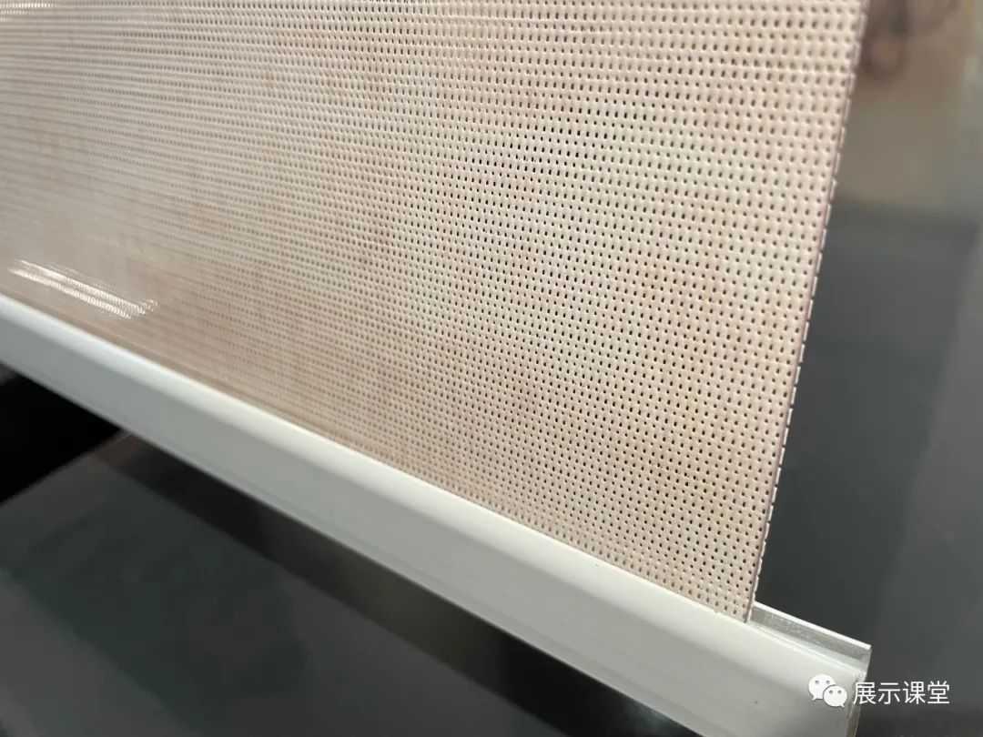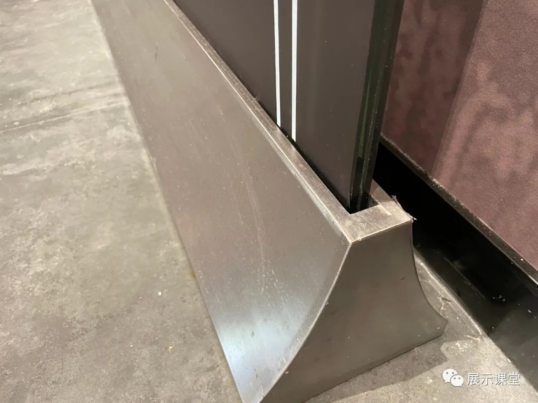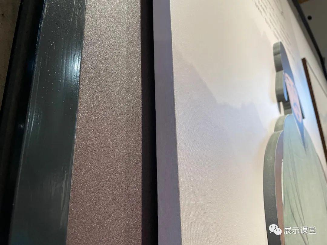 展板包边 :宣绒布UV的展板四边,用仿木纹铝合金包边处理,做工细致。
