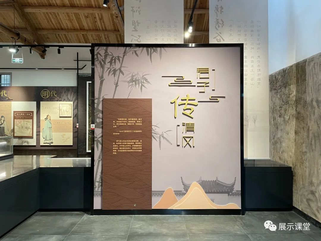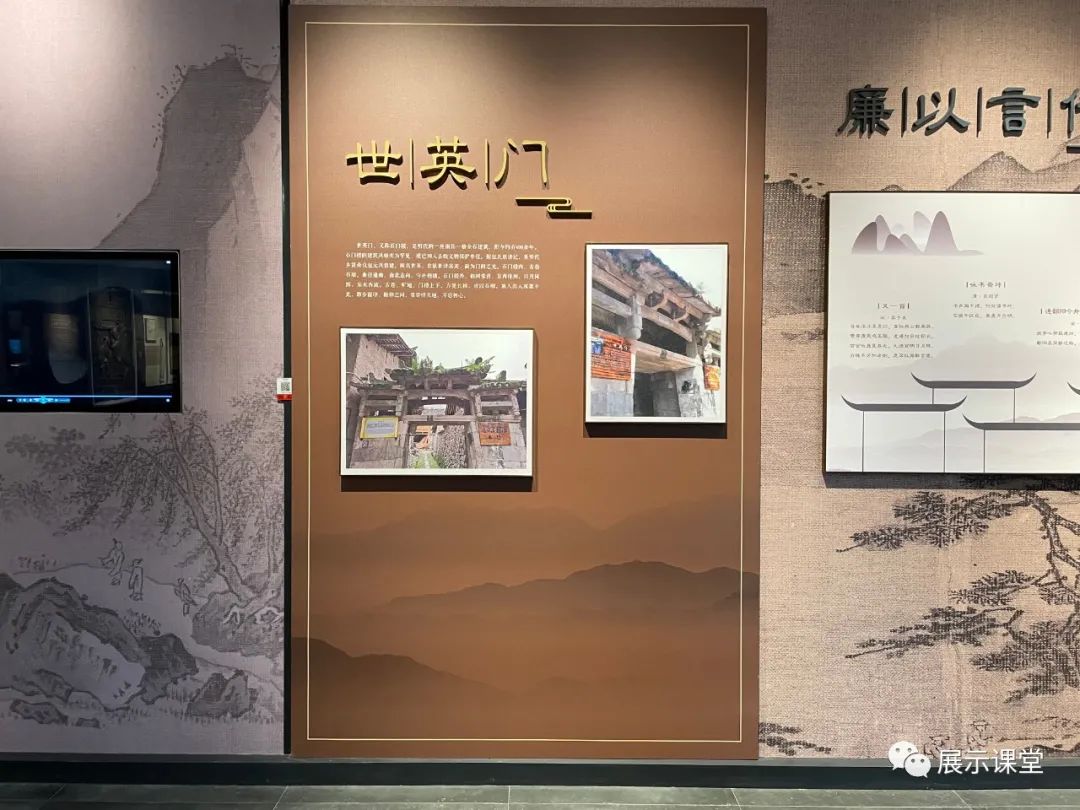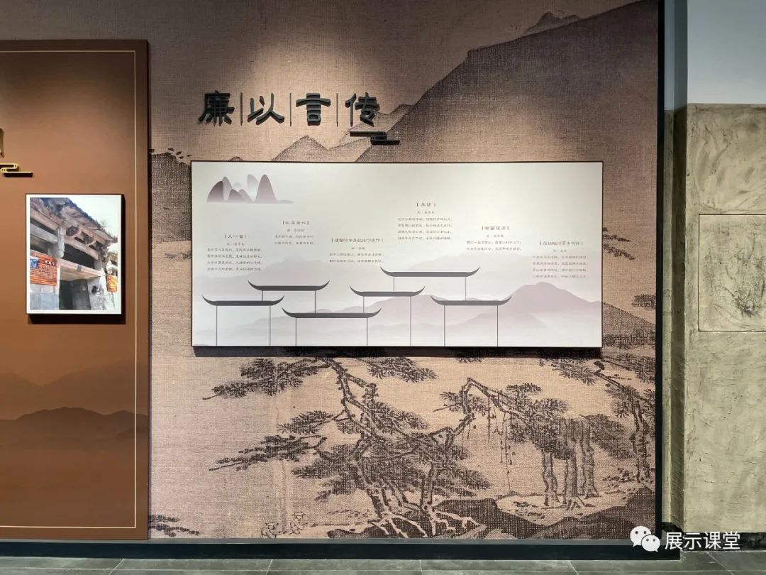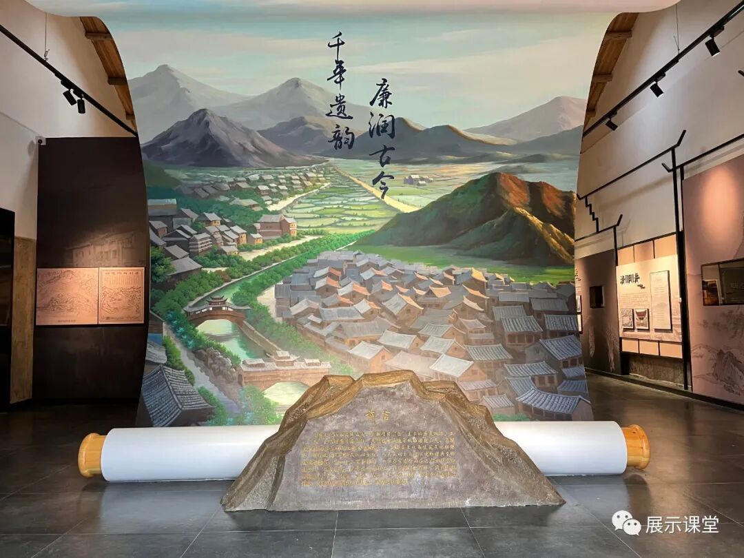 序厅 :一进入展厅,引入眼帘的便是一副千年古村的山水画卷,从顶面往下铺展开来,“千年遗韵,廉润古今”八个主题字以竖排的形式陈列,熠熠生辉。
