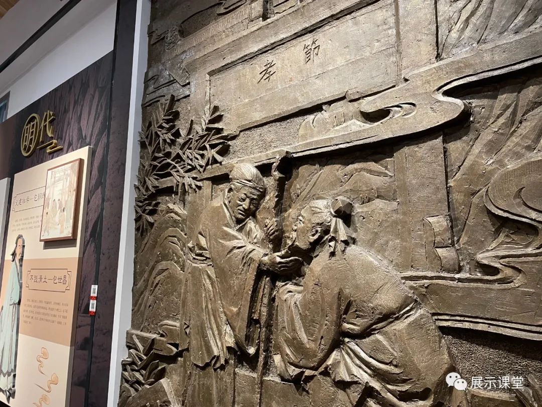 画卷中,采用雪弗板雕刻人物场景,前后错落,丰富了版面的层次感。