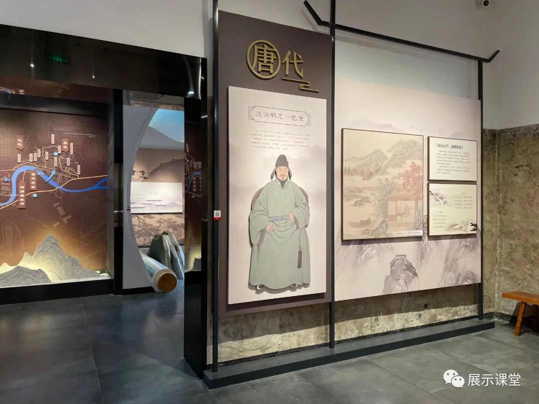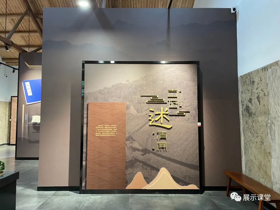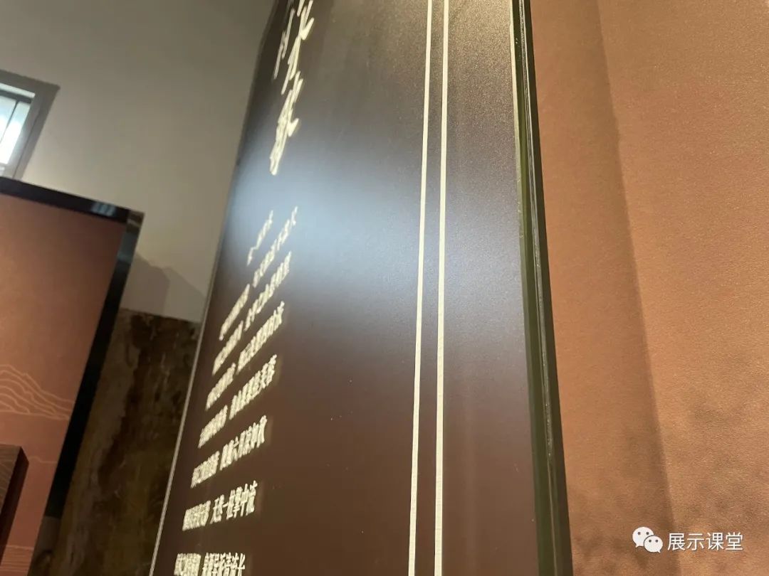 一级展陈标题:单元牌设计样式统一,以宣绒布画面作为背景,主题字及山峦剪影是采用雪弗板雕刻制作,通过厚度增加立体层次感,单元介绍文字采用密度板外包油画布制作,单元牌用黑钛金不锈钢进行包边处理,防止壁布翘边,工艺制作精细。