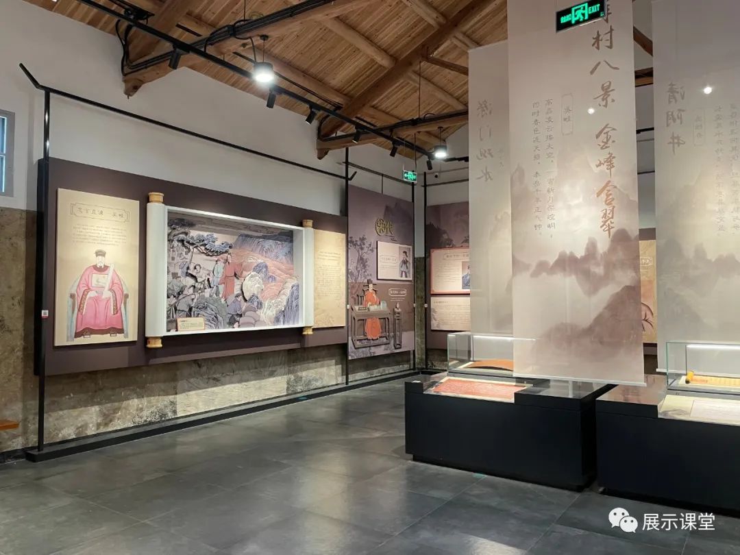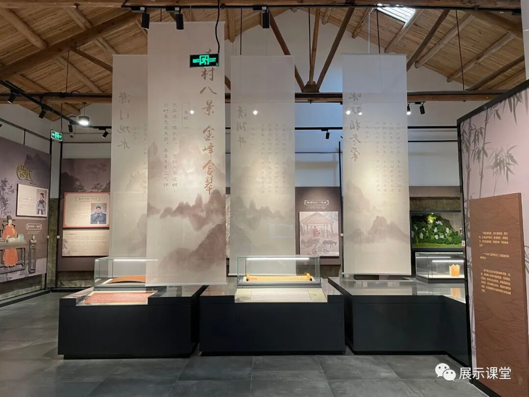 建筑空间 :木梁结构的人字形屋顶,空间层高相对比较高,中岛展柜区域,顶面采用垂挂无纺布画卷的形式,介绍形容库村的诗歌。射灯轨道采用吊筋悬挂,最大限度保留了原顶的空间通透感。