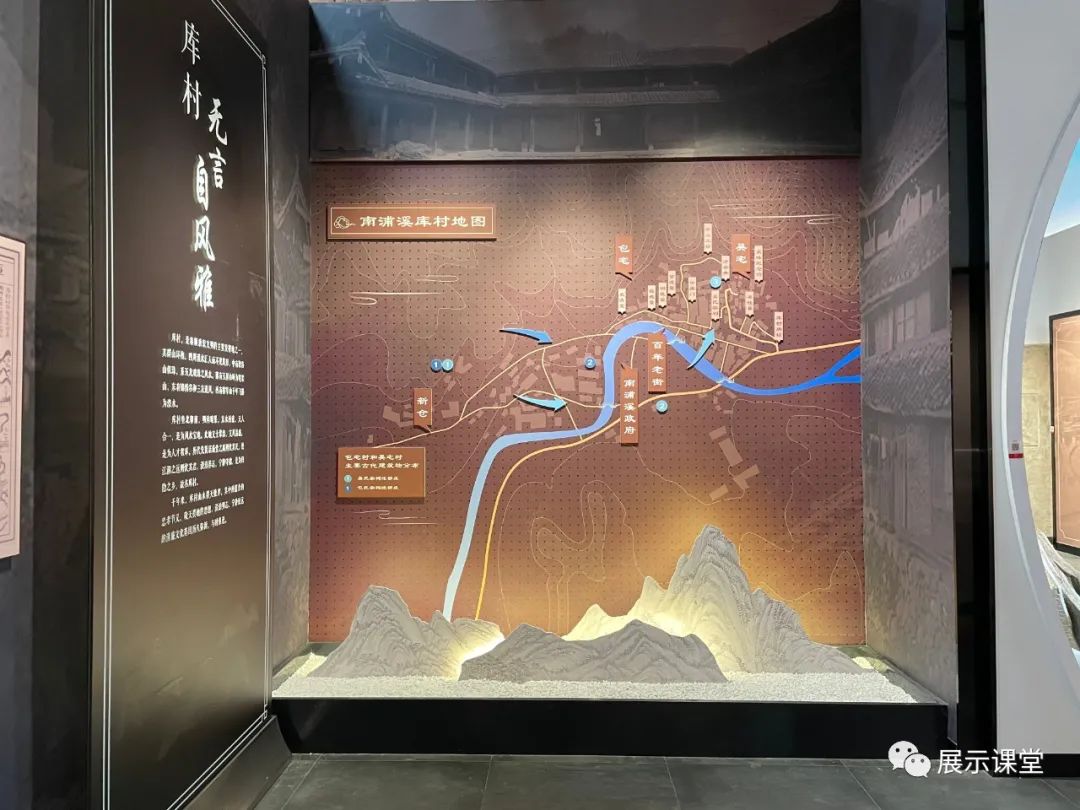 库村地图 :库村村民主要分为包氏和吴氏这两大氏族,场景以写真画面作为背景,雪弗板雕刻建筑标识,地台上铺满小白石,雪弗板雕刻UV的层叠山峦,背后暗藏LED灯带溢光,营造出库村山景的意境空间。