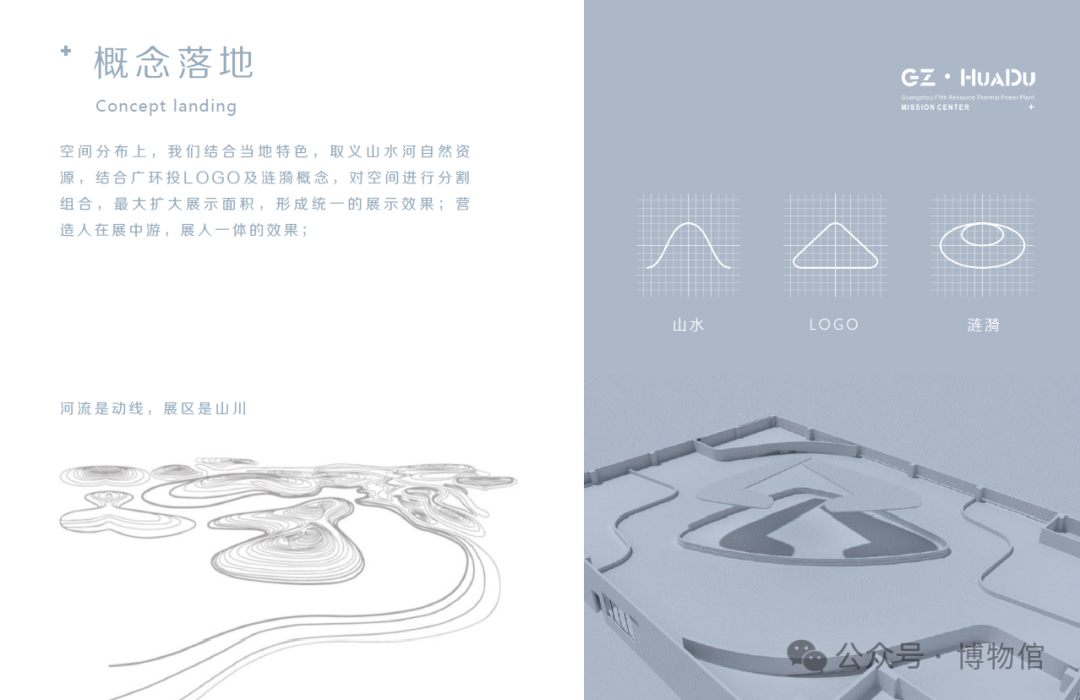空间分布上,我们结合当地特色,取义山水河自然资源,结合广环投LOGO及涟漪概念,对空间进行分割组合,最大扩大展示面积,形成统一的展示效果;营造人在展中游,展人一体的效果;
