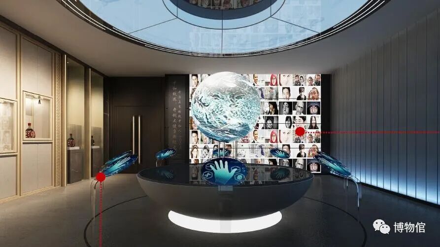 让市场合伙人共同将手放置在感应手掌上,将共同点亮中央象征着走向致中和未来的发光球体。一侧墙面上捕捉显示着参观人群的人脸肖像.