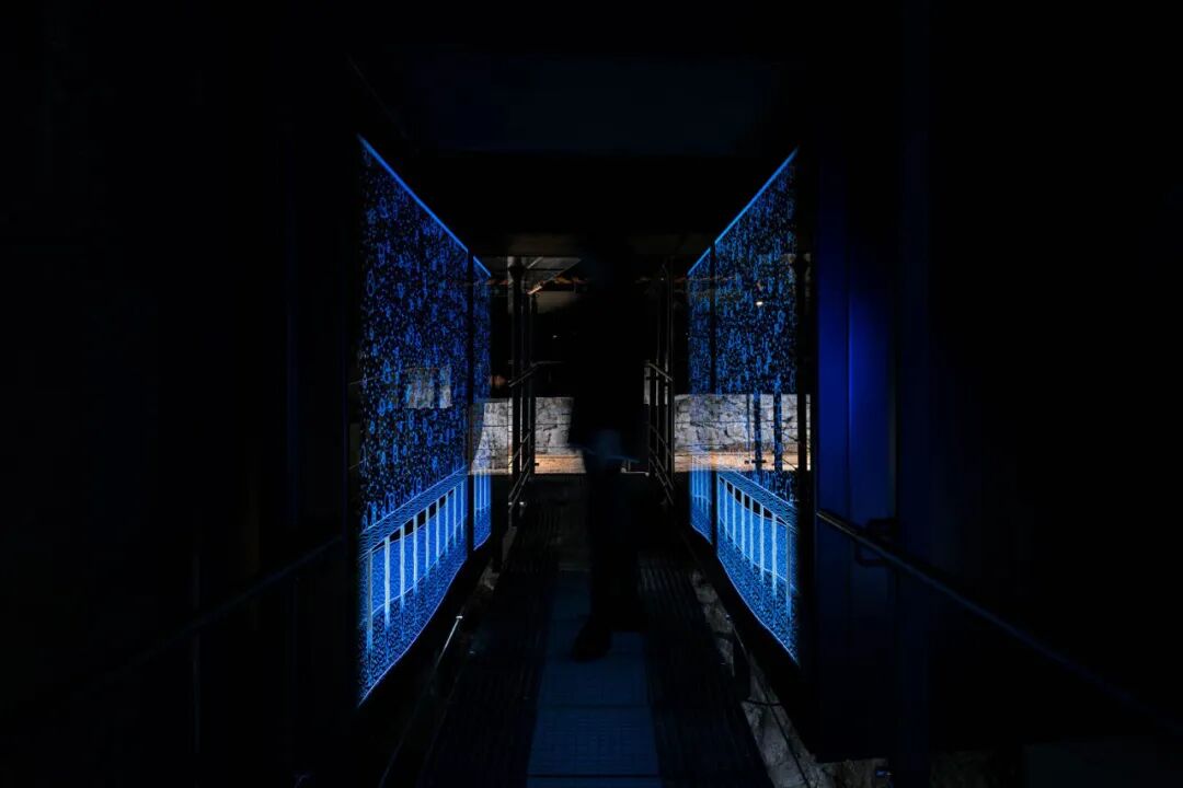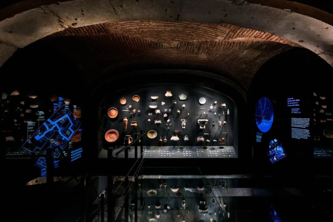 从序幕室开始,参观者进入过去。在导游的带领下,他们体验了挖掘过程,穿过一座可以进入挖掘现场的桥。该指南使用 iPad 激活了现场投影到展品上的光线、声音和信息层,展示了它们的确切发现位置。包围空间的黑色玻璃墙上的动画插图提供了其他信息。发光的蓝色和白色花丝线条在黑暗中脱颖而出,将挖掘变成了舞台布景。
