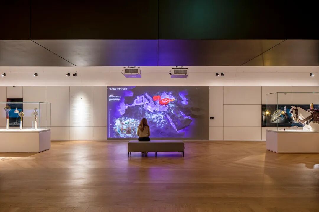 在展览的设计中,它旨在将不同时期的文物在一个场景的背景下汇集在一起,并创造一个空间设计。每个博物馆展柜的尺寸都根据展出文物的要求和展览部分的空间叙述进行。每件作品的展览都参考了自己的背景,展览基座的设计和放置以将文物置于最前沿,以及在颜色选择中与文物颜色的和谐。在内部,具有特殊空调系统、照明和安全技术的展示柜用于保存和展示文物。