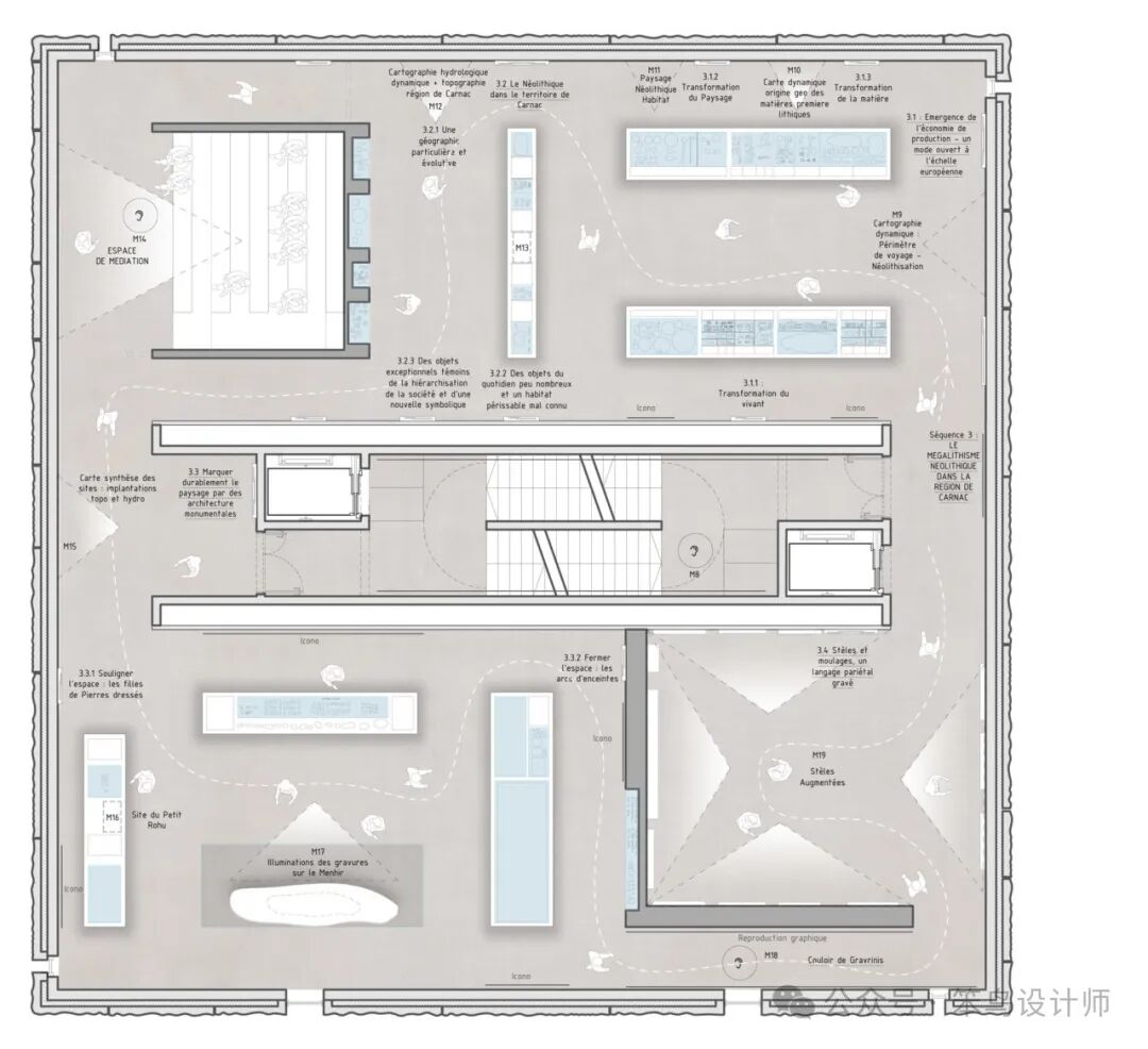 在刻意营造的沉浸式场景中,设备和家具被视为岛屿。这样一来,空间的边缘就被清理干净了:以图形和数字形式建立了卡纳克过去和现在领土以及更广泛的莫尔比昂的多重联系。
