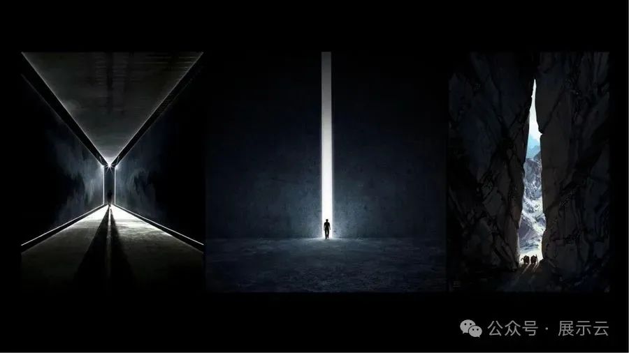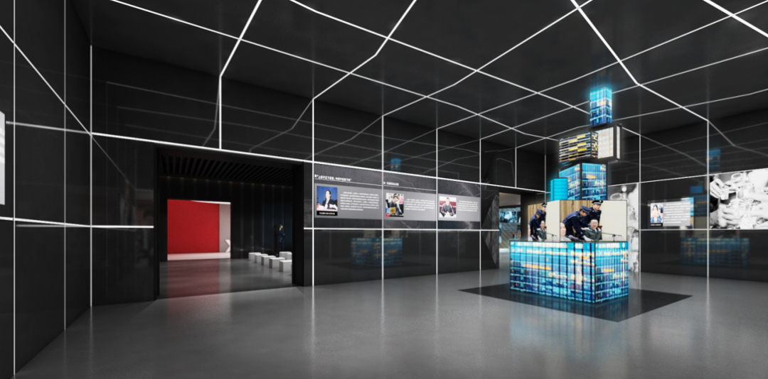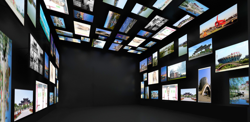 在一个暗环境内,从墙面上一个个小屏幕依次播放各行业代表的初心开始,最后,顶部及两侧墙面数十块幕布同时点亮整个房间,其中穿插代表本行业(党政机关/政法系统/教体系统/卫健系统/基层/国有企业/纪检监察)的特色口号、标志、镜头或德州元素老照片。比如,党政机关干部参观时,顶部屏幕展示“全心全意为人民服务”;卫健系统参观时,顶部中间屏幕显示“+”;教体系统参观时,顶部屏幕展示“桃李满天下”;以开门见山的方式,通过各行各业的人阐述自己的初心,将参观者直接带入情绪之中。