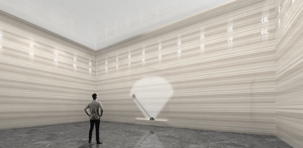 随着观众拨动节拍器,在有节奏的摆动中,Logo灯将“舍得”“进退”“输赢”“挣扎”“坦荡等”一些对立的词语依次打在左右两侧墙壁之上,表现出初心不坚定的人面临的内心节奏,同时预示观众:人生面对很多诱惑,一旦把握不准内心的节奏,就会误入歧途。