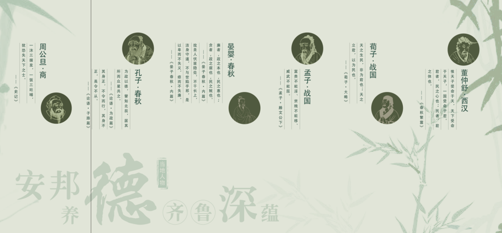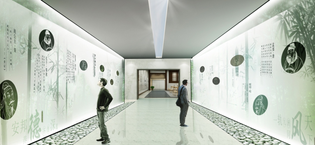 穿越过叩问初心的感性空间,接下来我们来到一个清雅明亮的古风空间。两侧运用四君子之一的竹子作为主要元素点缀其间,同时配以我国古代先贤清正廉洁的典故和思想(德州当地清官廉吏:萧惟豫——以忠事君,以孝事亲,以廉为吏,以学立身,真可谓正人君子。 )使整个空间荡涤着清风廉韵,带给参观者美好的体验。